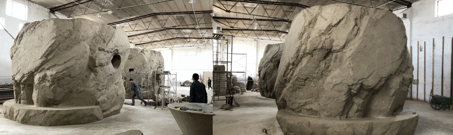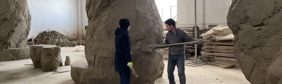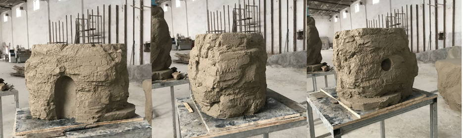 这个地方是1:10泥土的小模型,确定好它的大小、肌理、洞口的位置没有问题,就把它放大到1:1。