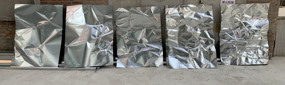 我们第一次做的实验是用手加工,第一次的实验失败了。但是当我们自己用手做加工时,越来越知道应该用什么样厚度的金属板,折多少次会出现什么样的图案。比如说折两三次会出现大的图案,折叠得越来越多就会出现越来越细腻的图案。最后在现场,我们的设计师、实习生,大概是10个人左右,一张一张地用手折再打开。总共有200张左右的金属板,都是我们自己以手工的方式折叠的,金属板的部分不是请施工方来加工,而是设计师在现场用手一张张做加工的。
