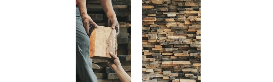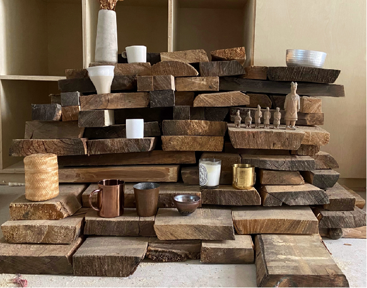 这是一个卖家居的小型室内空间,是实木家居的品牌店。到他们工厂时,我看到了他们库房中有很多这样的木头。很多木头是废弃的,很多年前买过来放在库房里,不会再使用了。我看到这个场景时,就觉得这个感觉挺好的,所以想用他们库房中各种各样废弃的木料做展示的墙面。