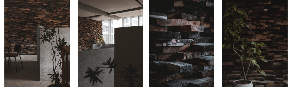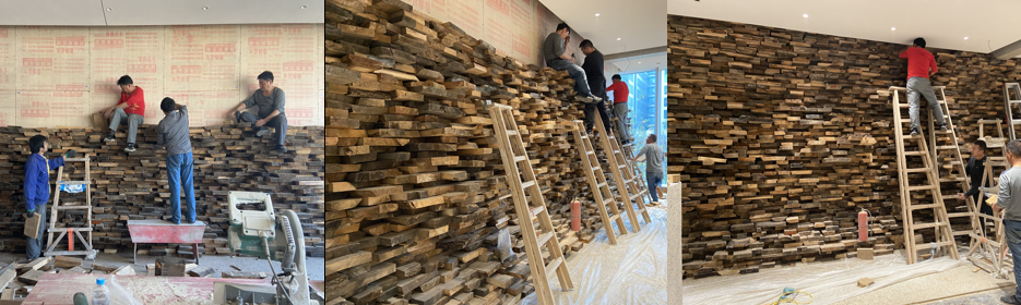 我们开始做施工。施工的过程时,一个木头拿过来,设计师在旁边看这个木头的颜色、状态、变形情况,然后看安排在什么位置合适。大概有两三天的时间,设计师都在这个地方,看下一个木头是什么样的状态、应该放在哪里。通过这样的过程,我们做出了一面木头的墙。虽然对于整个空间来说,这面木头墙是很小的一部分。但对我们来说,这和一般木头的墙不一样:它有一种力量,有一种生命力,它有一种故事,有一种记忆。我认为这些木头是被设计师尊重了,而不是按照设计师的想法,把原本自然的、多样的东西做成标准的感觉。