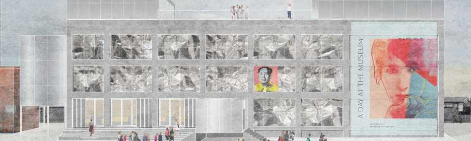 我开始思考用身体做设计”的项目是北京的隆福寺木木艺术社区我们要把这座建筑改成现代艺术的美术馆这是我们当时做的项目方案图我们把外立面做成了金属质感,做成了没有窗户的外立面。