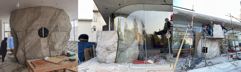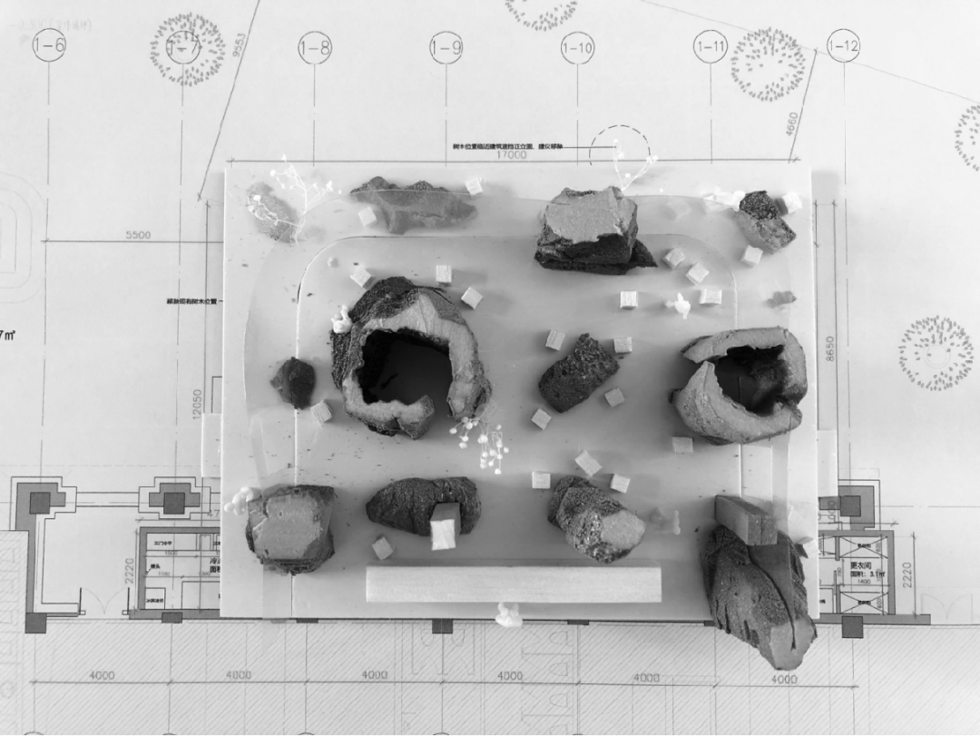我们先用手做了一个模型,大概是1:100的小模型,空间中有好几个不同造型的石头,在平面中有一些是变成包间,有一些变成了街过,有一些变成桌子或是椅子,随便的大小和造型散落在空间里。这些模型不是用脑子做的,而是用手做的,更多地是随意地去做造型,表面肌理上也更多是偶然做出来的效果,整个流程都没有用电脑做设计。第一个模型是在工作室做1:100的模型,确定造型之后放大为1:10的模型,是用泥土来做。确定所有的造型之后,再把它放大到1:1的尺寸,也是用泥土做的。所有的设计用1:1的模型确定之后,用混凝土做一个现浇,把一块一块的混凝土送到现场安装,才组装成最后的空间。