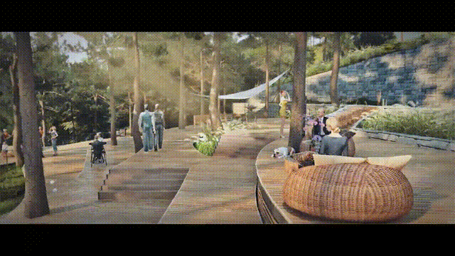 我们通过模拟平行岭谷创造重庆独一无二风格独特的的地形、地貌、模拟植物生境,让自然回归城市。竖向的高差,通过架空的廊桥进行解决,立体的植物关系使用模拟植物生境的方式得以呈现。天然氧吧就此呈现。