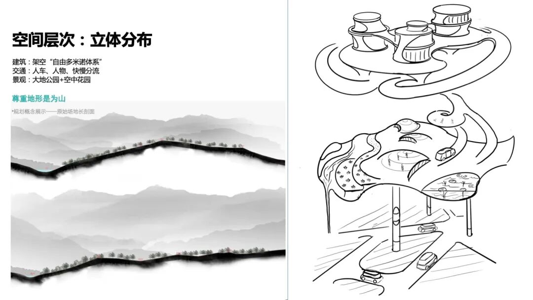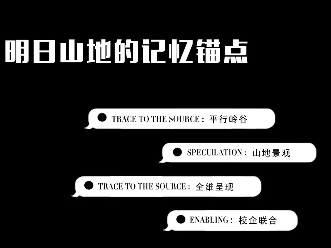 思辩:寻找中华文明的智慧,我们发现,他的演化的底层逻辑与山地景观息息相关,他也是精神文明的一种寄托,情绪和环境之间对话。我们以此为线索,对山与地的研究,经历了1.0-2.0的持续迭代,有正向的研究,以山为笔,以地为底的顺应,亦有反向的思维对抗,先情感,再空间,关于记忆,关于趣味,关于秩序,关于平和……二者不断转换。
