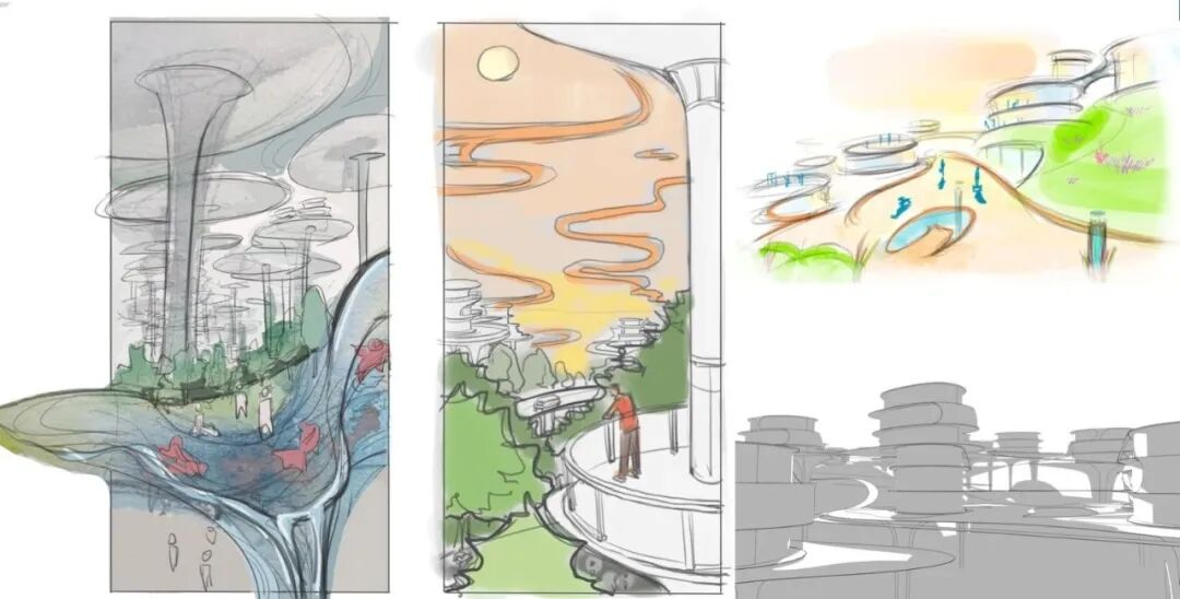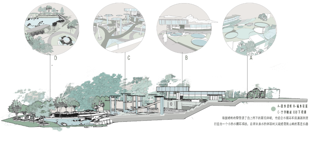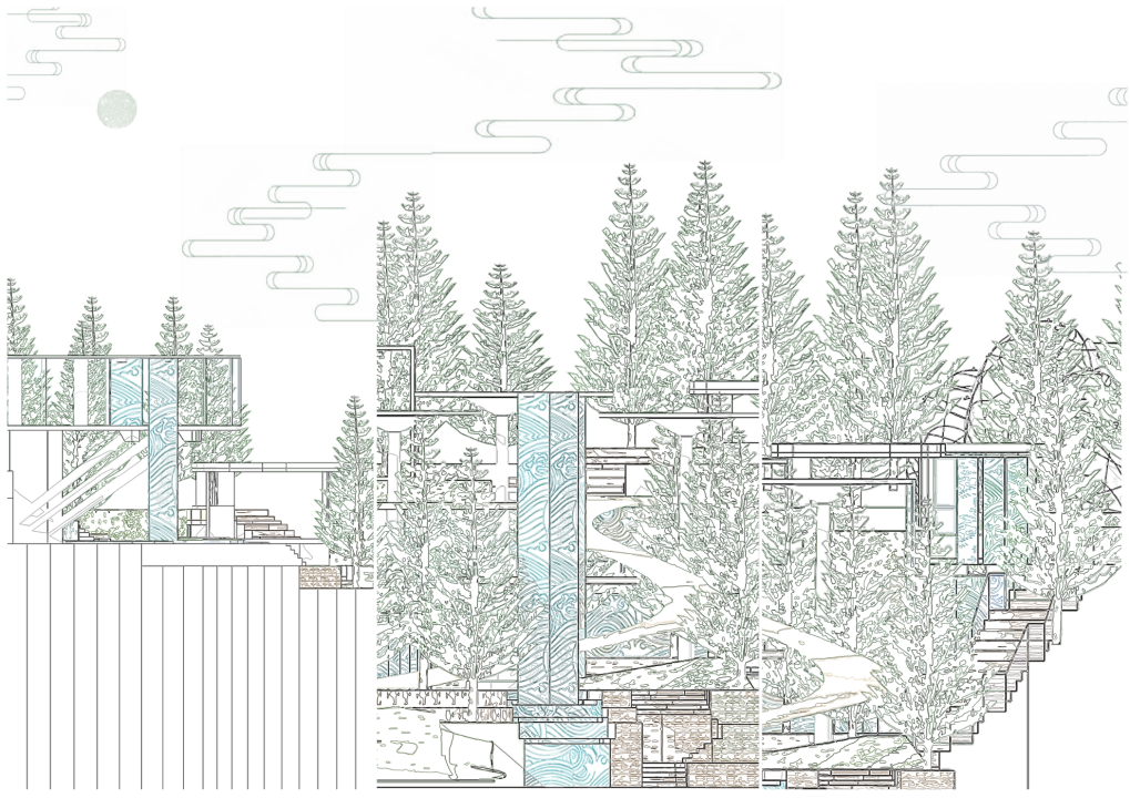 “源山”从山中来,向山里去,至上而下的地势营造未来山地人居关于非平面上的体验。现代的设计理念配合古代水墨画似的表达方式。不仅仅只是一场跨界融合视觉盛宴,同时在设计当中穿由地势所引导的川流,利用水循环、雨水收集等实际办法对生态进行治理,形成往复循环的自然山水人居。
