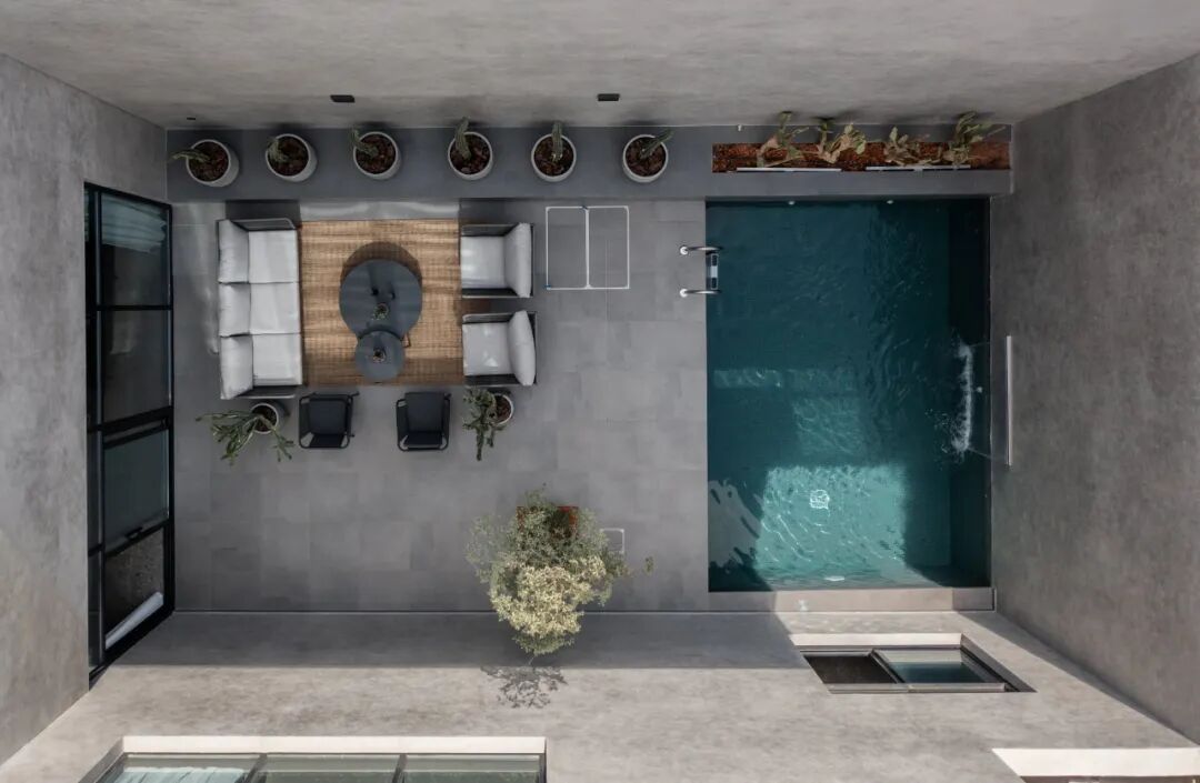别墅分为三个垂直层,底层为半公共空间,如客厅、庭院、厨房和餐厅,以及室外庭院,而上层则为更多私人空间,如卧室和私人休闲场所。