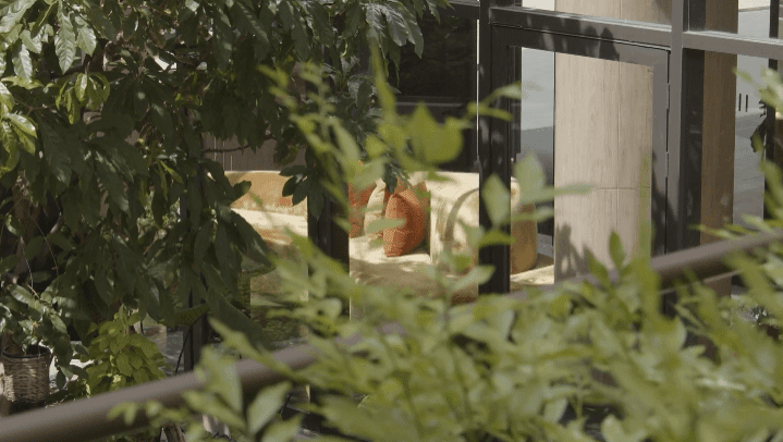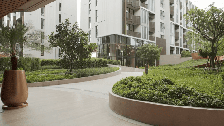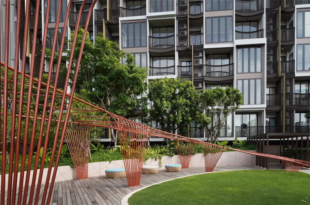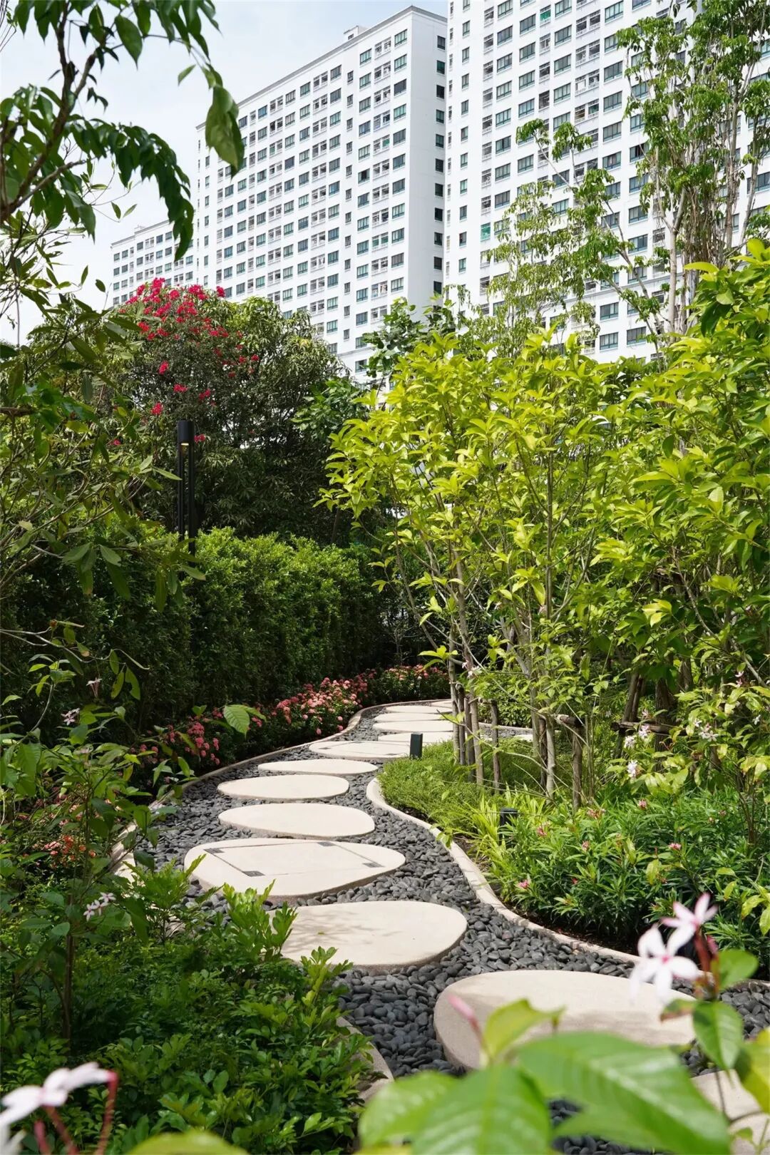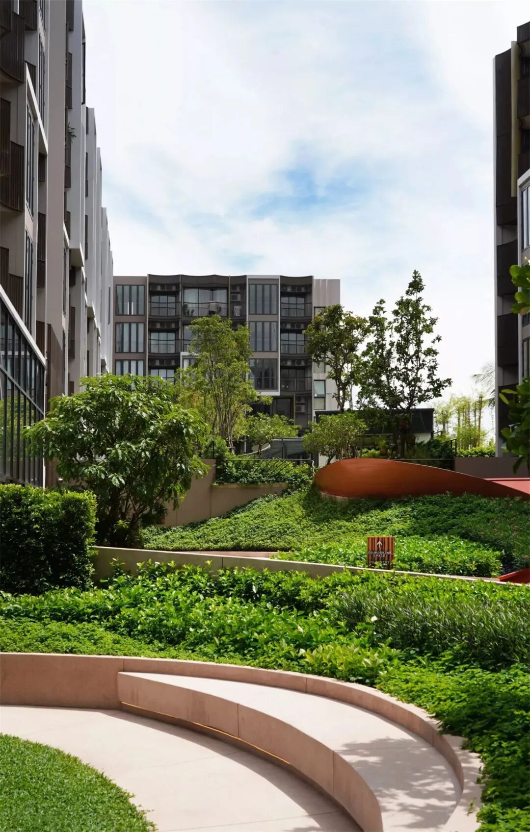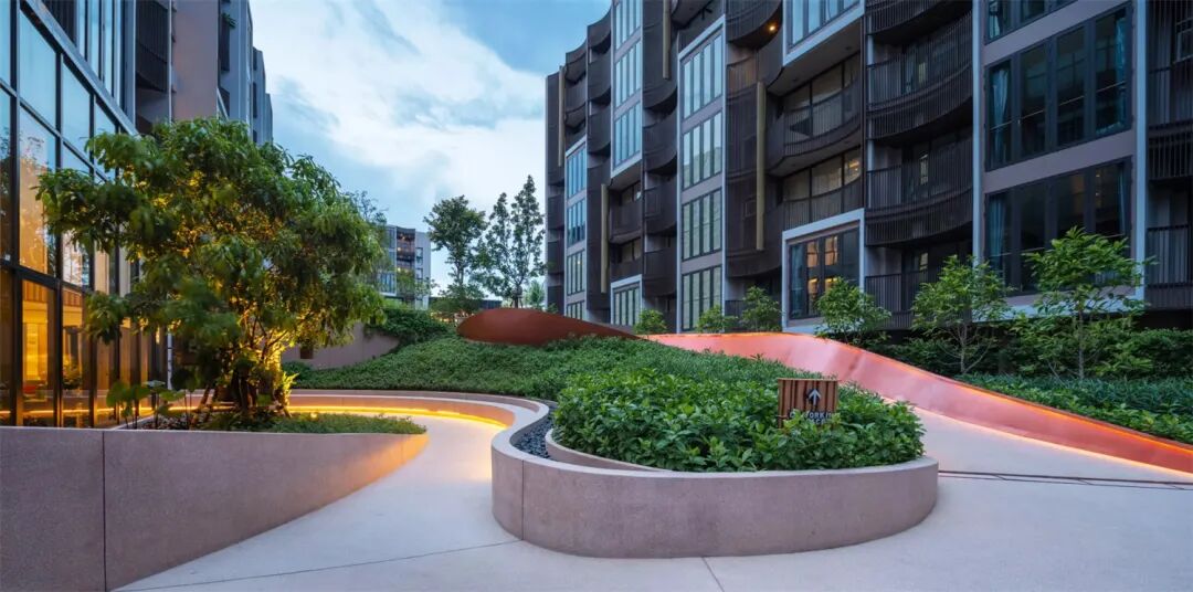 在蜿蜒的道路边,绿植郁郁葱葱,进入住宅中心区随处可见座椅,人们可以在绿意盎然的户外露台上休息。
