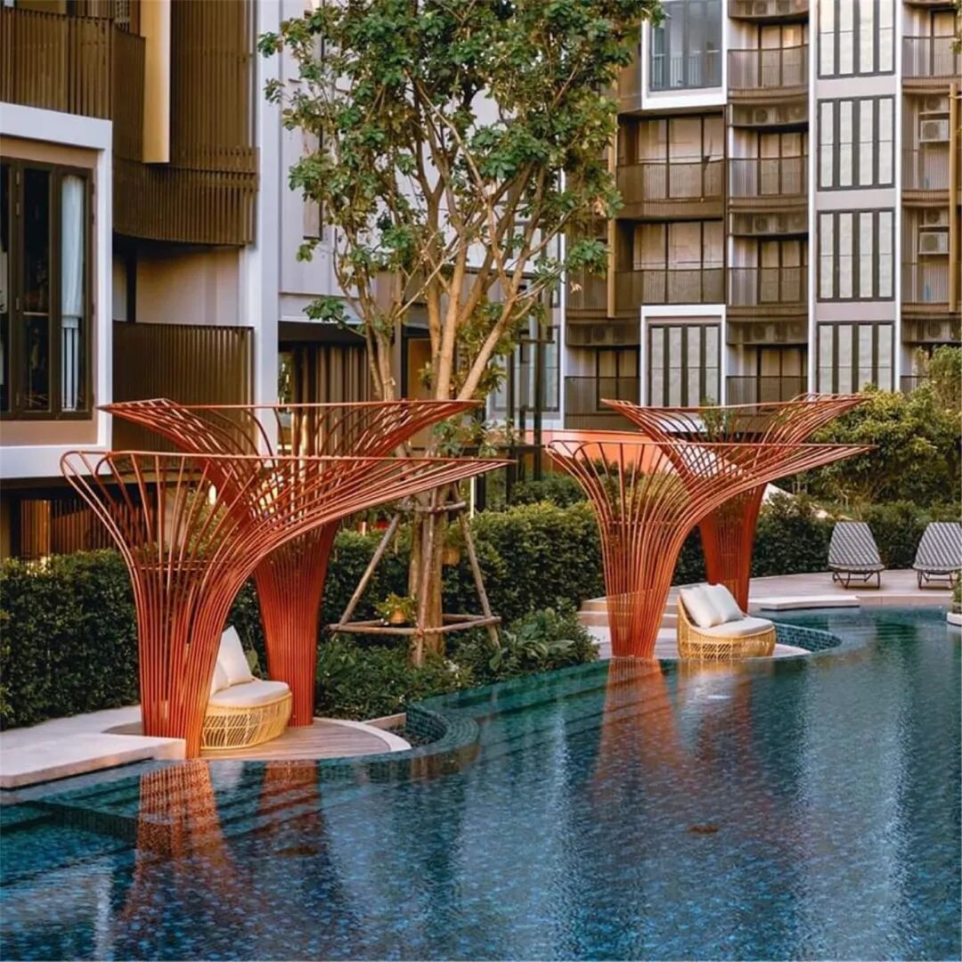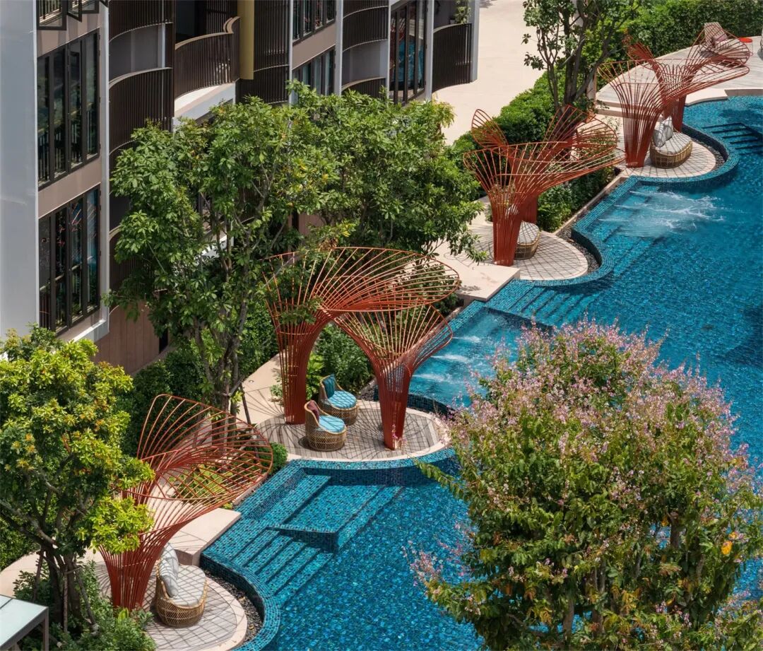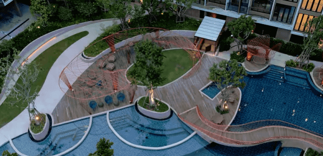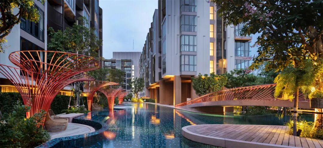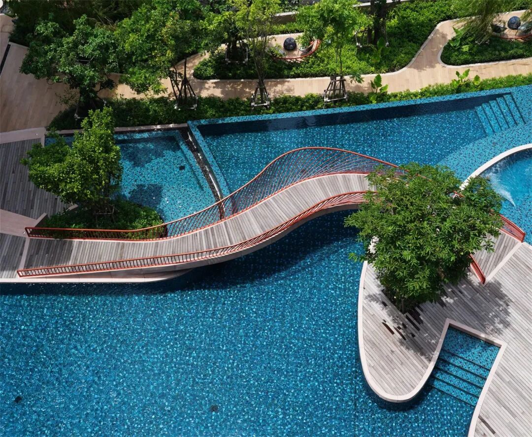 整个景观动线以流线型贯穿项目,道路、桥梁、泳池、树池等,弧线的造型贯穿始终。