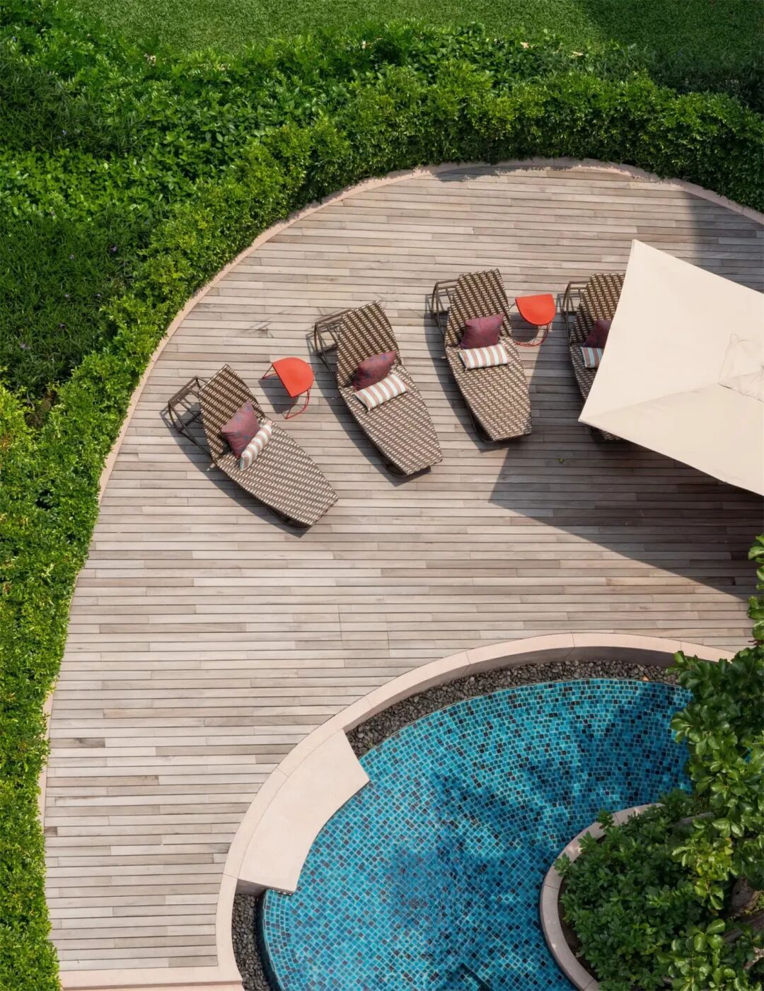 项目每一个细节都设计到位,汀步小径、泳池收边、冲淋设施等,而室内的设计也十分出彩,Bug Studio的室内设计利用大面积落地窗将室外环境尽可能引入室内,舒适自然是必要条件。