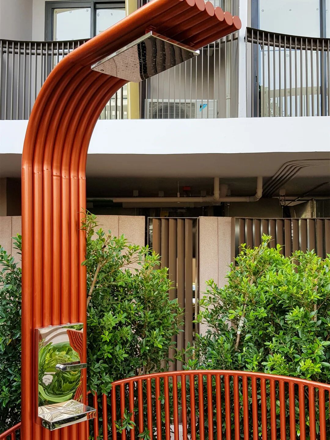 进入项目人们一眼就可以注意到橙色的弧形“旋流桥”,层叠的绿植被曲线的挡墙分割出不同区块,缓坡减少了高差的压迫,营造出流线的路径。