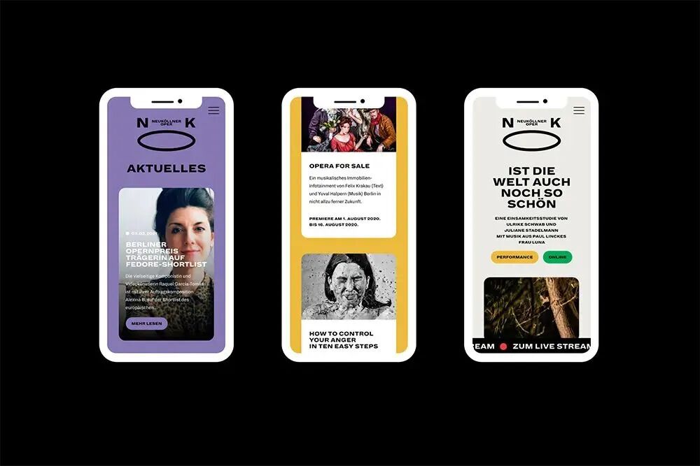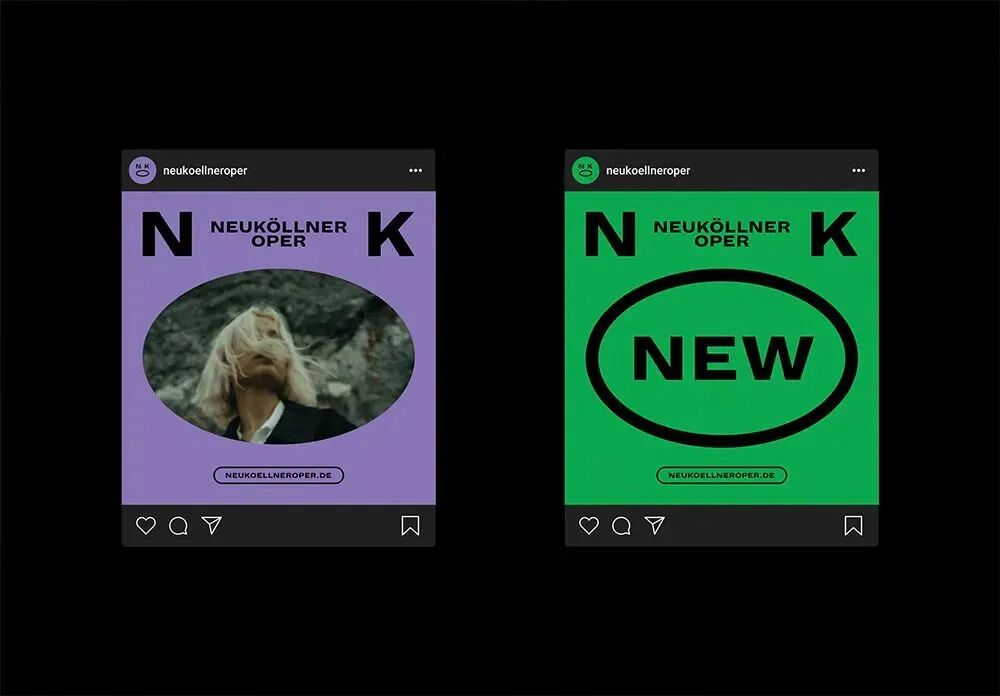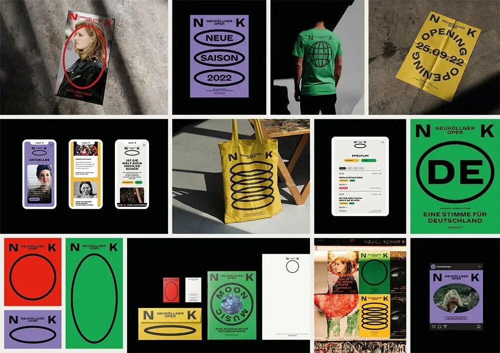 升级后的LOGO更加俏皮和灵活,引入了一个可以向任何方向挤压和拉伸的圆圈,以适应它所处的不同排版布局。圆圈的两侧各有一个大而醒目的「N」和一个「K」字,使Ö字看起来像正在张大嘴巴歌唱。在数字环境中,NK下方大大的O字母会基于中心水平轴旋转,在视觉上产生不断张开嘴巴唱歌的视觉感受。