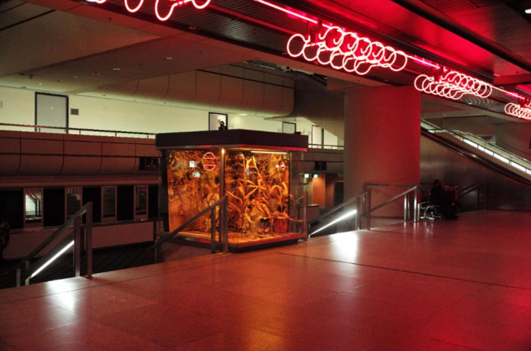 中心标志性的照明系统及其彩色霓虹灯线圈重新亮起,参观者立即进入一个发光信号系统:红色和蓝色波段、电子操作面板、监视器。这些信号向他们展示了如何到达较低的两个楼层和较高楼层的两个房间的不同活动地点。