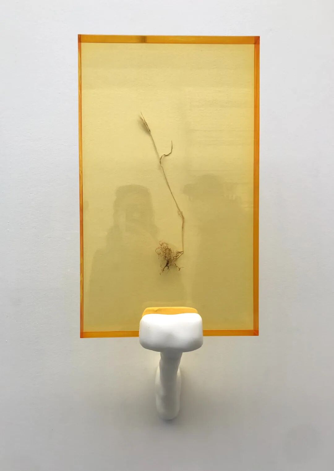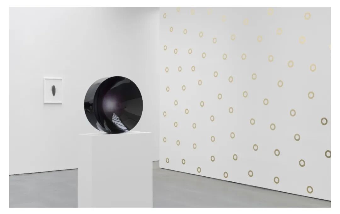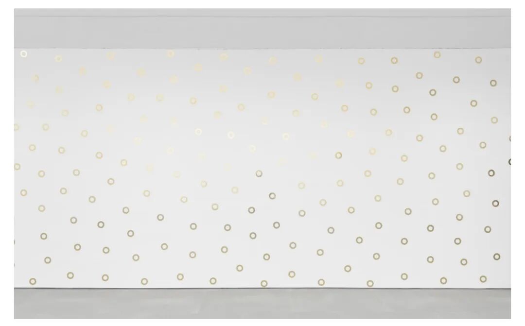 This work forms a spatial, conceptual and material threshold between two distinct experiences. It instigates transition, unburdens us from the material density of the preceding rooms. Thomas Schütte’s wall installation Goldene Ringe (1981/2022) materializes the light within the room, Fred Eversley’s parabolic lens concentrates the energy of the surrounding space, while Canicule #3 (2011-2017) by Ann Veronica Janssens and Gentle Memento Mori (2020) by Marianna Uutinen impel our bodies to move, to feel as much as we look.
