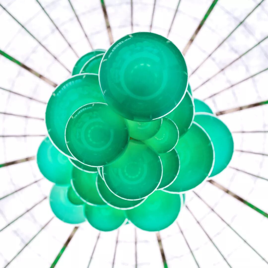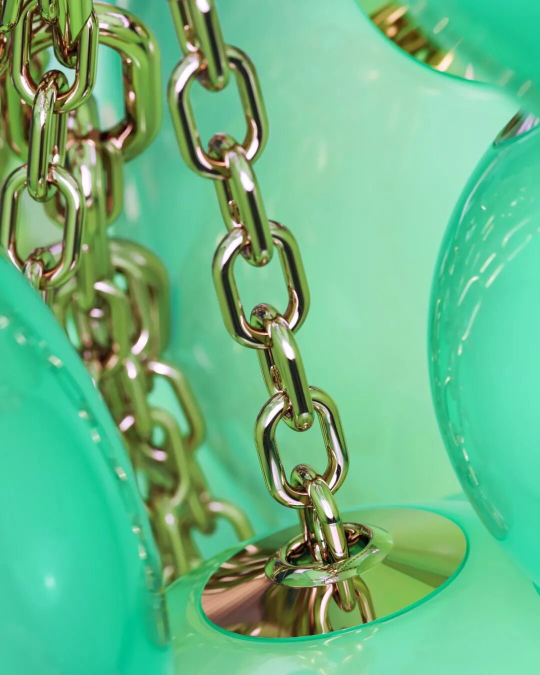 受到渔夫网的启发,Helmi 灯包括一系列手工吹制的玻璃「气球」,每个「气球」由一个 LED 灯泡照亮,并由金链网悬浮在空中。