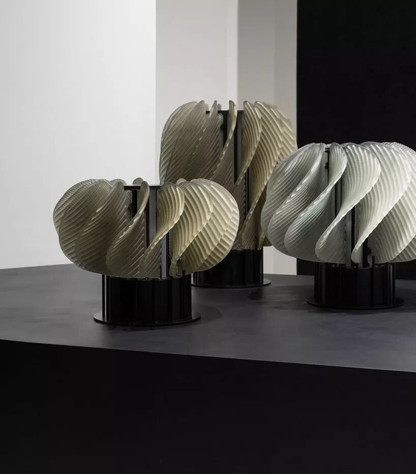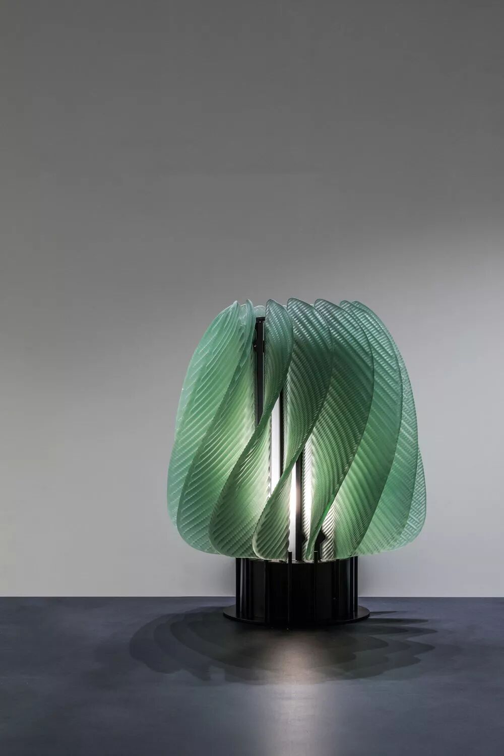 每盏灯都是由弯曲的玻璃「叶子」连接到一个旋转马达,玻璃部分专业地使用玻璃铸造技术组成。光线隐藏在中心,营造出渐变的光照。