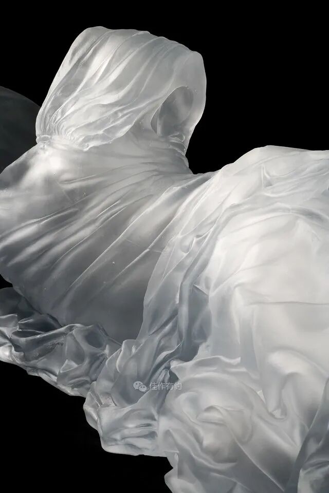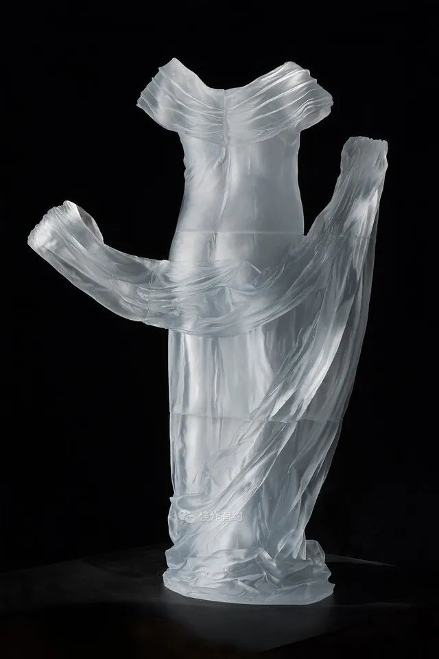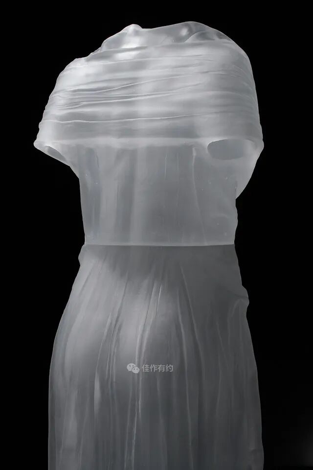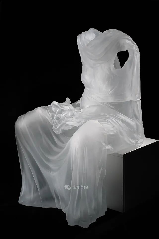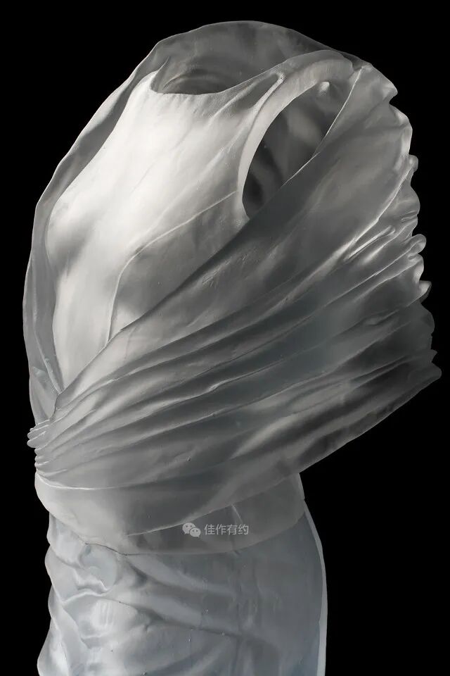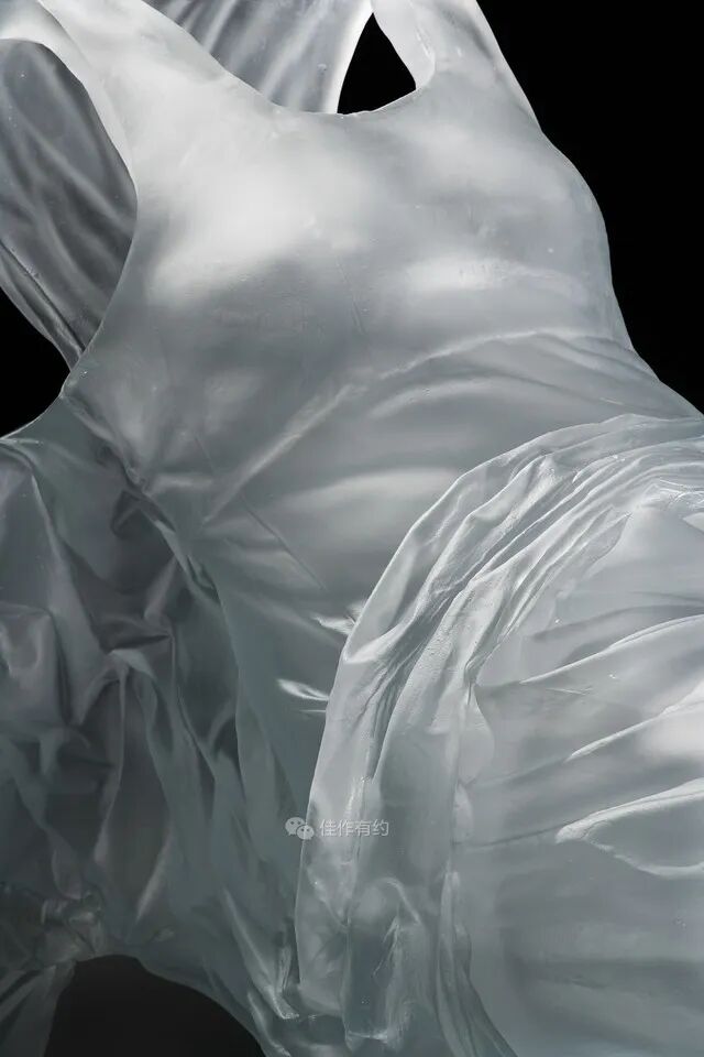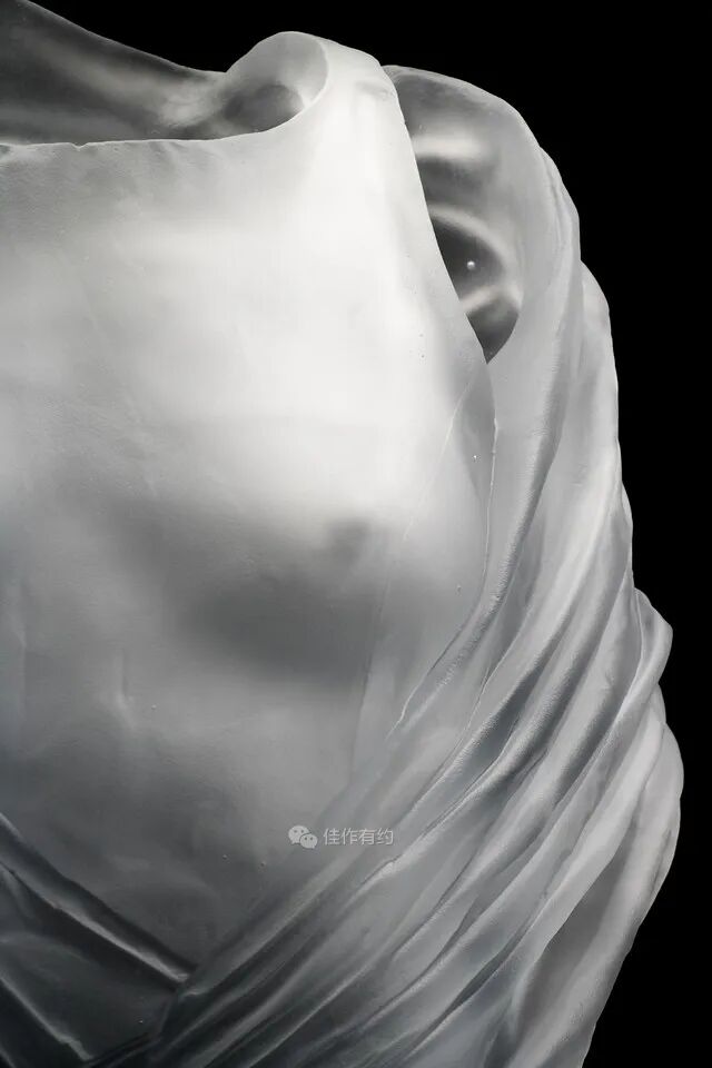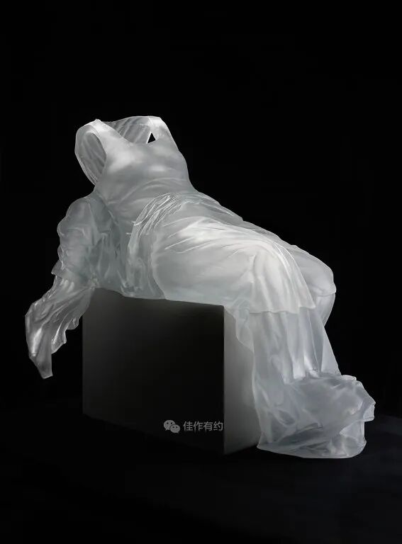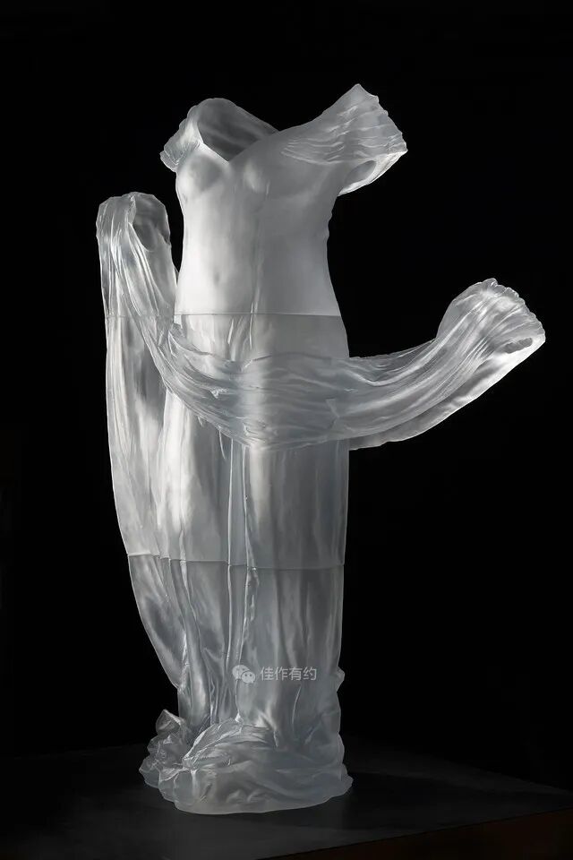 KAREN LAMONTE 用披着透明玻璃裙的不在场的裸体来研究人文主义与情色、物质与空灵、身体与精神之间的紧张关系。这些雕塑既有强烈的物理性——肌肉和肉体紧贴着紧贴的织物——但又没有实体:人物不存在,只有压在衣服上的形状暗示了这一点。