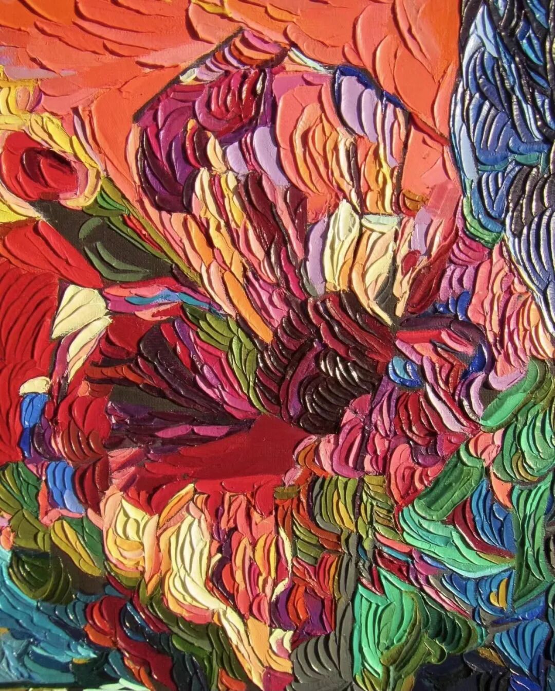 Alisa Denoizz 的作品具备鲜艳的色彩和雕塑质感,以不同的流派和样式在画布上表达着她的热情。她用油画颜料和调色刀创作作品,重点是色彩强度,纹理密度和笔触效果。