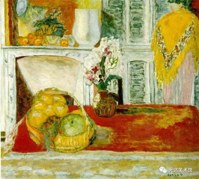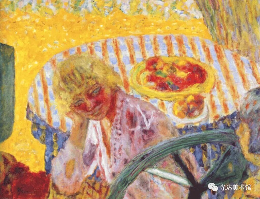 五十年前,事情要简单点。博纳尔的外甥,夏尔·泰拉斯,在给现代艺术博物馆一九四八年博纳尔个展的画展目录作的序里写道:他的舅舅“只想画点快乐的事物”。这话里有可曲解的余地(他想画,但是没做到),不过这大概并不是作者的本意。不管怎么说,这话可无法让今天的人们满意。快乐?伟大的画家肯定不只想画快乐的事物吧?快乐的故事纯洁无瑕,画快乐事物用的色彩,有人说只不过是“杰出配色师”调出来的。不足以让人满意啊。在这个节骨眼儿上,画家的生平事迹令人可疑地前来相救,给我们送来了勒妮·蒙沙蒂其人。如果说有哪个画家特别需要一个人牺牲自己来帮助他提升名望,这个画家就是博纳尔,而这个故事来得正是时候。现在,一生迷恋玛尔特这个模特、情人、妻子的博纳尔,被换成了另一个博纳尔:和玛尔特在一起三十年后,他爱上了勒妮,一个胸怀大志、比他年轻许多的画家,一九二一年向她求了婚,后来又退缩了(或者被玛尔特镇压了),然后发现勒妮死在了巴黎一家酒店的客房里。勒妮自杀身亡一年后,博纳尔与玛尔特成了婚。