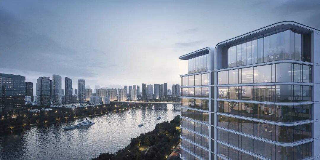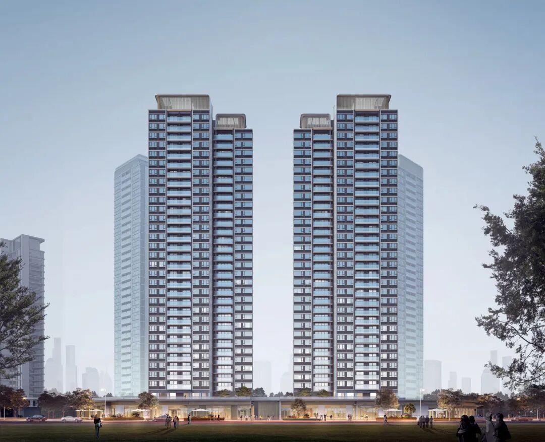 单体设计最大化呼应了江景、园景,均有良好的景观视野。酒店式的单元门厅,通透大气,营造归家流线。建筑立面运用了现代简洁的设计语言,大开窗体系营造时代感高阶住宅。整体色调呈深灰、米白和木色,打造轻松舒适氛围。而选材利用铝型材、石材、真石漆和玻璃组合,层间线条勾勒赋予外立面光影层次感与建筑轻盈感。