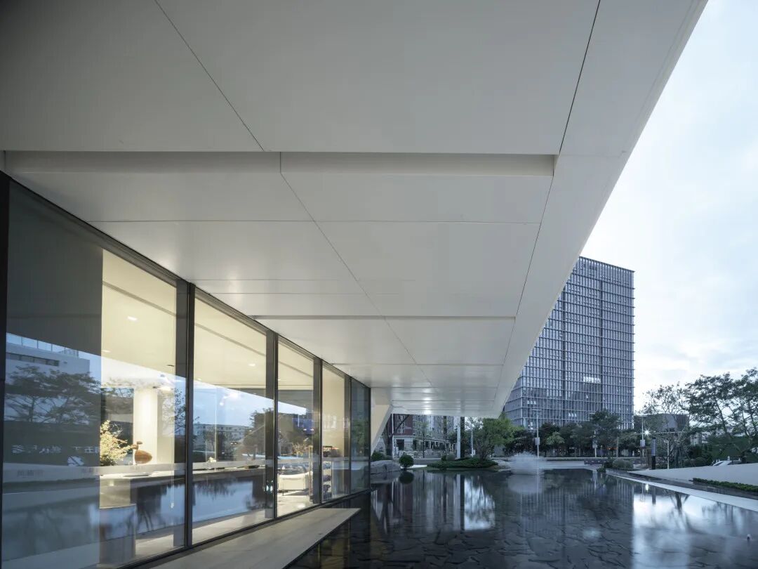 洋房屋顶运用轻盈的水平大挑檐,配合韵律变化的装饰线条。其基座部分开阔稳重,金属和石材的运用配以中式符号的点缀,彰显大家之气,是温润端庄的府宅之作。高层则运用重檐屋顶手法和简洁的线条进行整体构图,强调整体韵律美感,大量玻璃和浅色线条的使用彰显建筑形象纯粹干练的摩登质感。