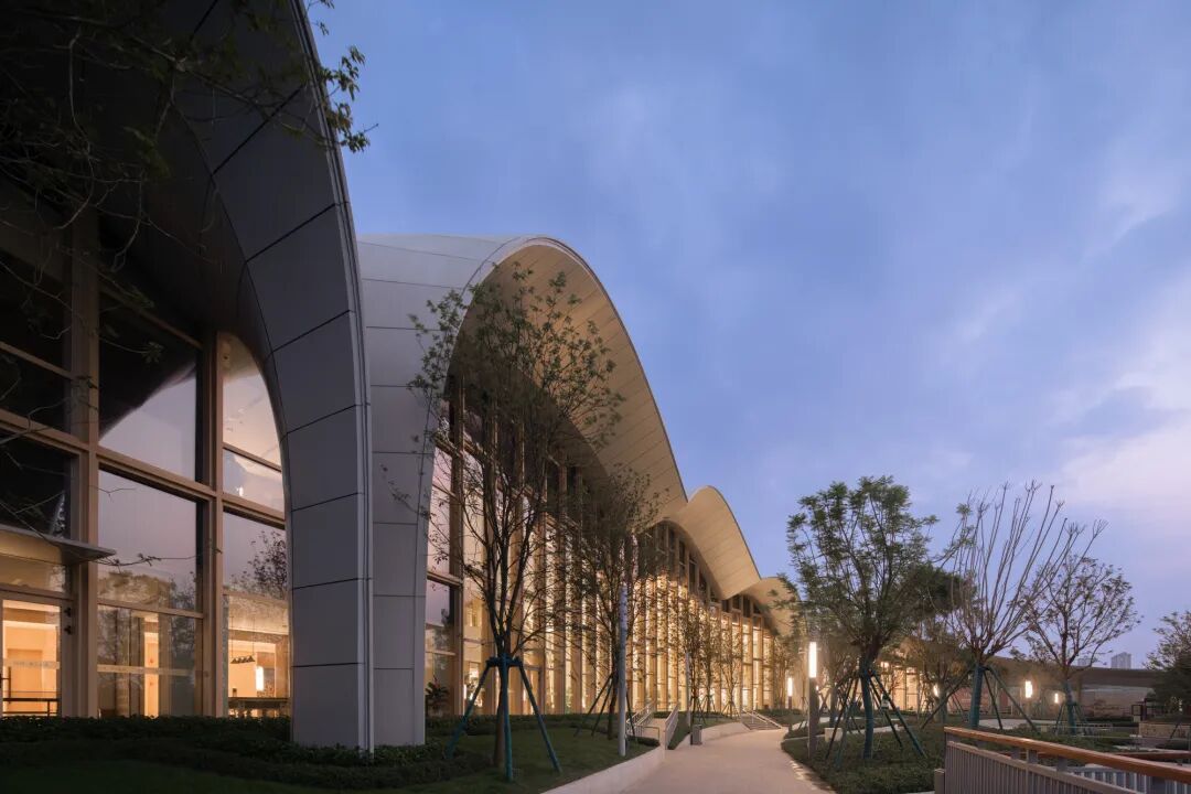 本项目充分考虑场地天然高差和优质景观资源,将最具公共服务属性的活力中心会所布置在养老地块居中的位置,便于服务整个社区。会所面向东北角公园展开,曲面屋顶下的空间富有喀斯特地貌的韵味。沿会所长廊观赏公园景色,宛如一幅步移景异的山水画卷缓缓展开。