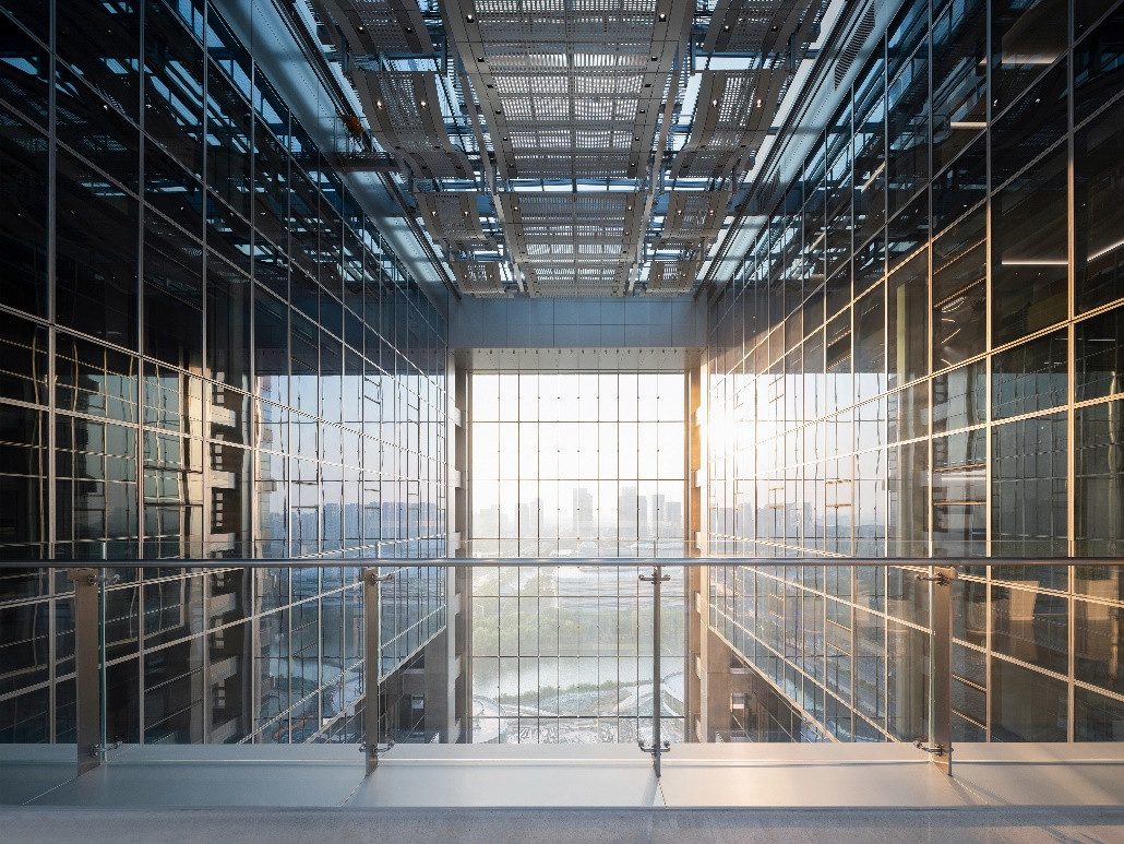 建筑采用结构外置方式,大幅减少了标准层的结构柱数量,创造出大面积的开敞办公空间,利于未来功能区的灵活划分。与此同时,外置的结构体系形成了对于力学的真实表达,并赋予了空间秩序。这种空间与结构的组合方式,构成了双擎大厦突出的艺术表现力。