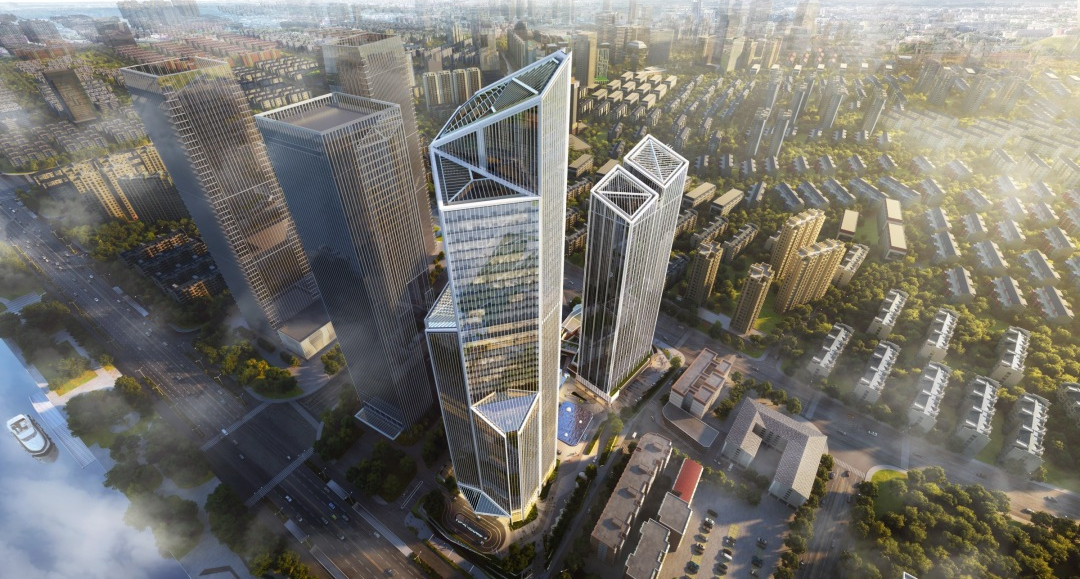 本项目以结合“晶耀湘江”为设计原则,进一步完善晶体的概念,主塔通过切分形成层次分明,逐阶生长的形象。次塔高低错落,呼应主塔,结合交错有秩的商业裙楼,形成完整的空间形象;采用竖向线条提升建筑的气势,加强了建筑的美感及细节度,也更加有效地降低了建筑的表面积,减少了外立面材料用量,符合"碳中和"的政策导向。