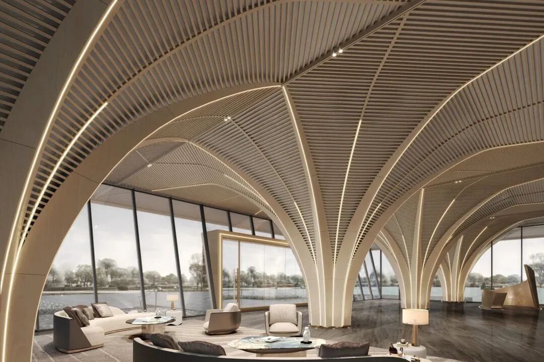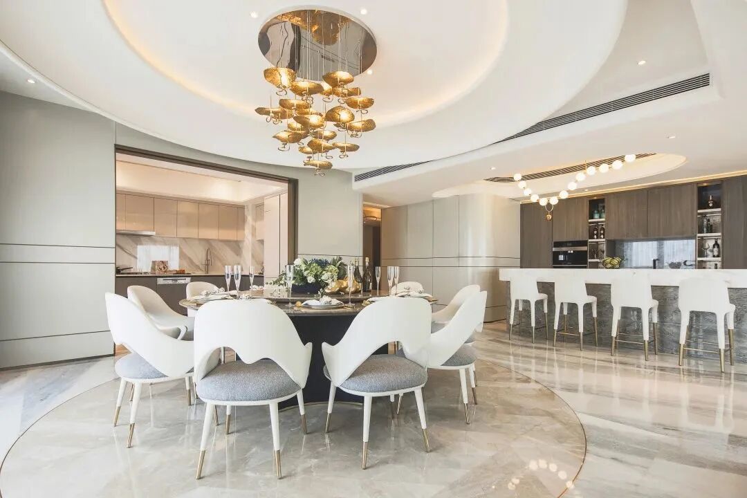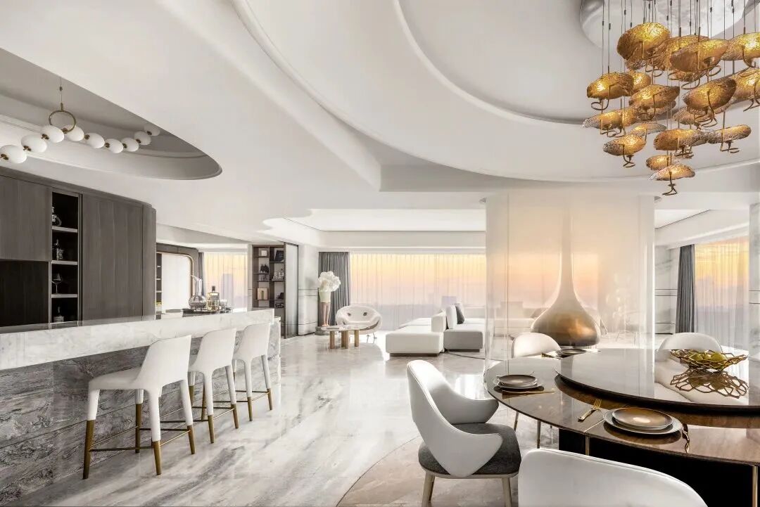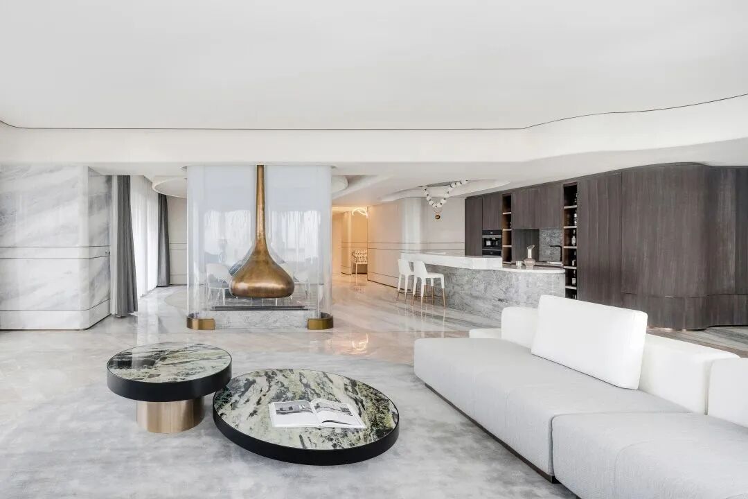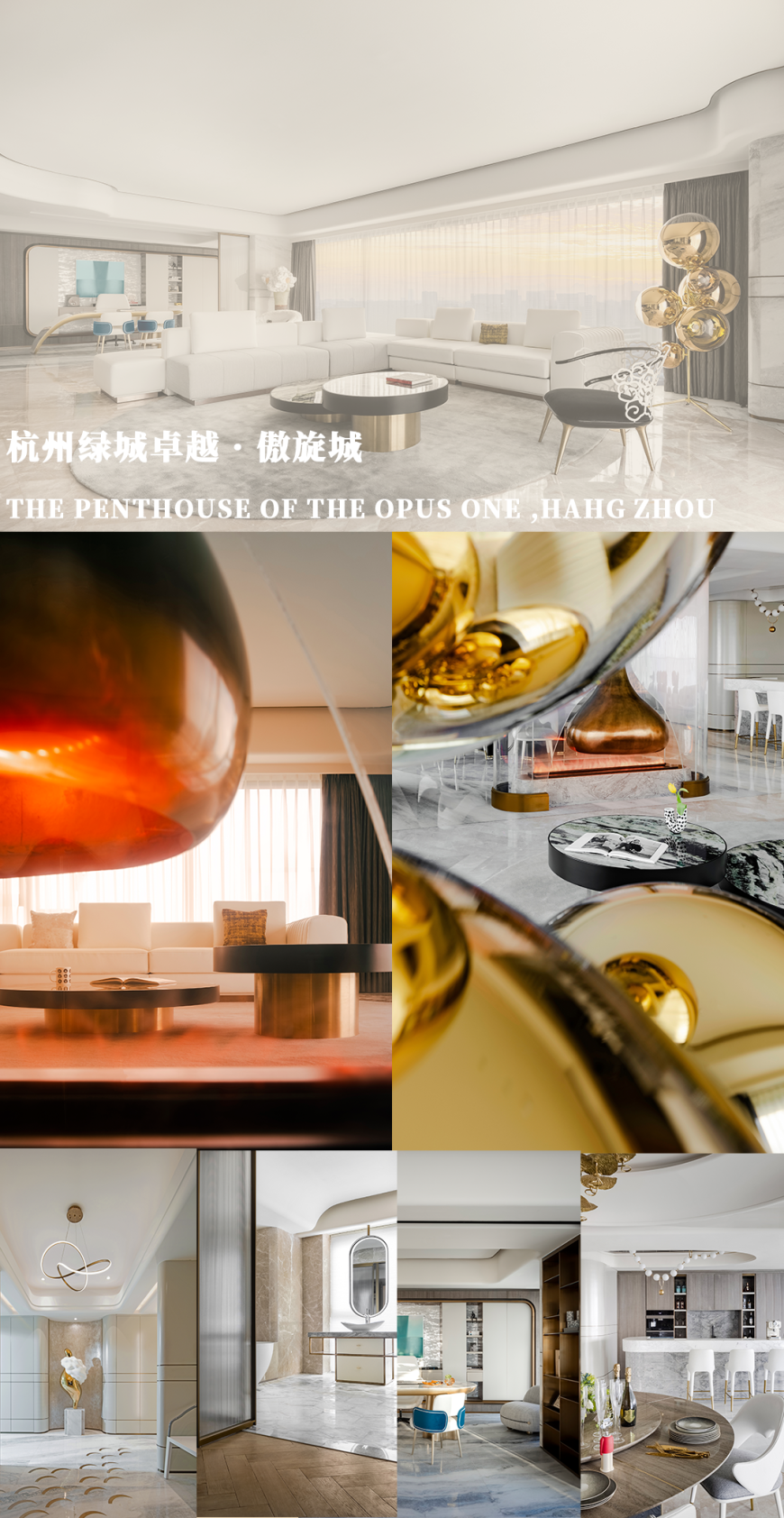 建筑面积约430平方米的杭州绿城卓越·傲旋城“天空之宅”,位于杭州滨江区。项目由室内设计大师邱德光亲自操刀设计,云雾缭绕的摩天大楼以一系列落地窗为特色,可以俯瞰钱塘江和西湖的全景。邱德光设计团队通过在室内创造云景,向令人惊叹的风景致敬,开启了居住者的想象之旅,探索和欣赏不同的美丽给他们的生活带来的意义。