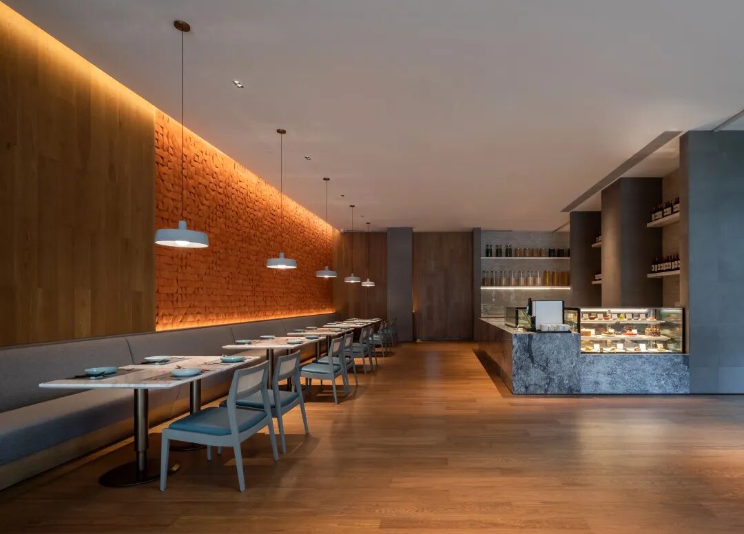 夯土墙面做为中原建筑的主要元素,被用在室内空间的主要构成里,与其相呼应的是一组组由室内设计方布局与构图,法国原厂制作的麦子壁灯装置,沿着室内空间连线绽放;土地的颜色变化也被设计师巧妙地运用在两个大堂的接待台夯土砌筑构造里,呈现出了这块土地上色彩斑斓的活力;麦子的意象运用也出现在包房的定制装饰吊灯上,在舒适全日餐厅与精致大堂的顶面,我们也看到麦子做为现代图案设计在空间里的呈现。