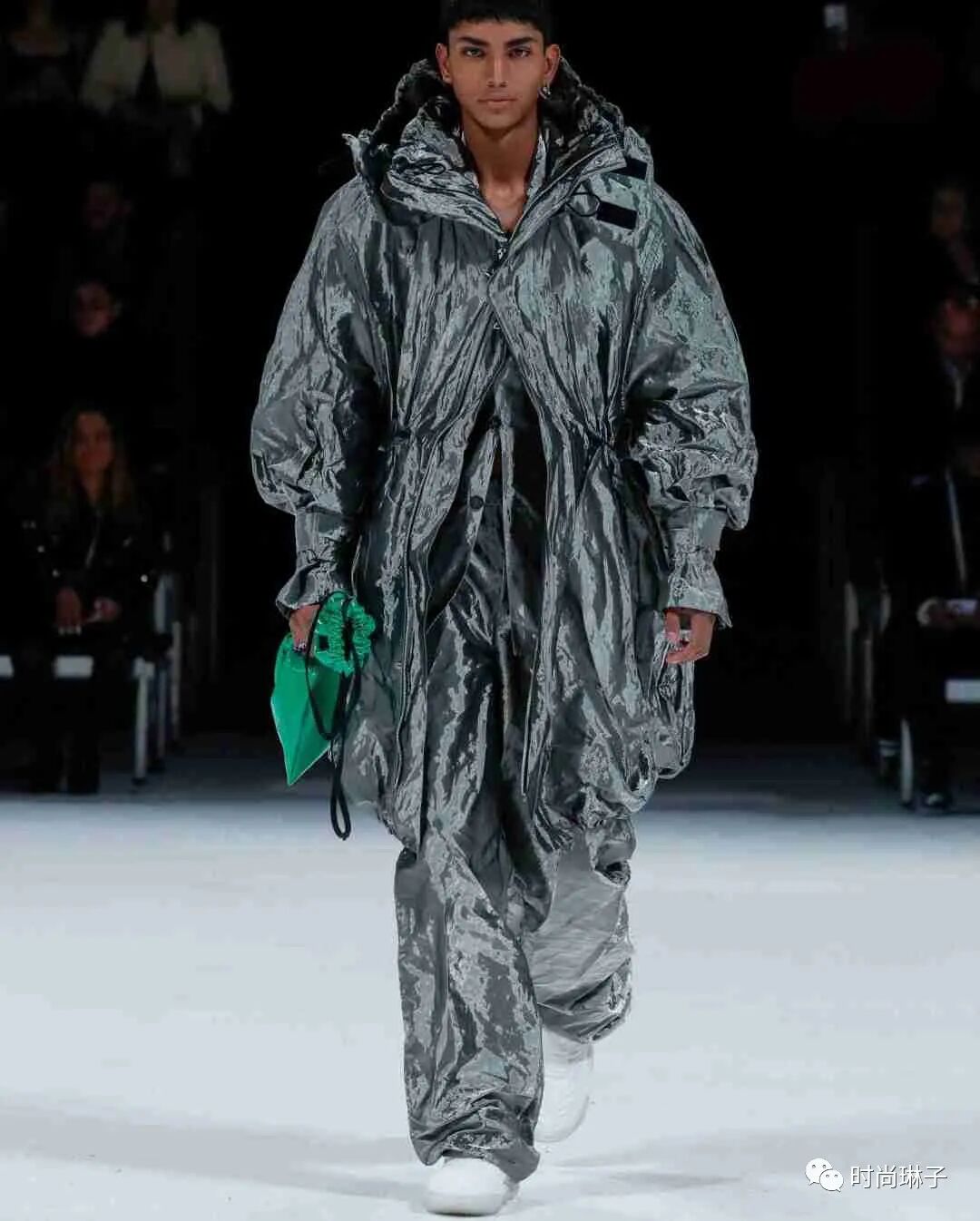金属纱线通过品牌标志性的编织工艺,融入该季的面料中,极具工业化雕塑的闪亮色彩。宽松廓形的外套,金属力量感十足。