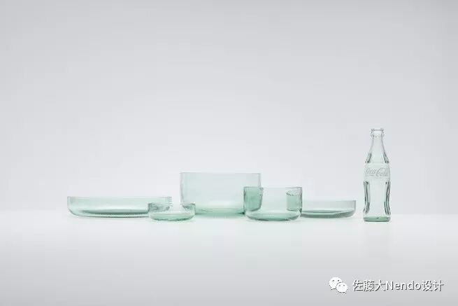 可口可乐的“轮廓瓶”自1916年成立以来一直是品牌标志。它也是可回收的:每次使用后,瓶子可以收集,清洗和重新填充以供进一步使用。该餐具系列由在广泛回收过程中劣化的瓶子制成,不能再用于其原始用途。我们被被称为“格鲁吉亚格林”的特殊绿色色调所吸引,并且通过精细的气泡和扭曲作为回收玻璃的标志,所以决定创造简单的形状来增强这些特性。但我们也希望用户能够感受到新产品中独特瓶子的残余。我们的解决方案是创造保持其独特的较低形状的碗和盘子,就像顶部被切掉一样。在生产过程中添加以减轻热影响的瓶底上的凹陷通常不是强烈的视觉特征,但它是玻璃瓶的特殊特征,并且任何拿起瓶子的人都可以看到。将这些环形凹坑保持在我们的碗和盘子的底部也有助于传达关于玻璃在人们制造,使用和再循环以供进一步使用之间循环的方式的重要信息,以及在这个过程中人们之间的联系。