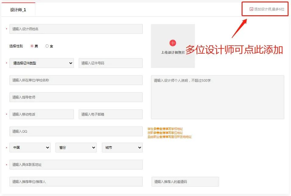🟣按要求填写参赛者信息(*号为必填,下同),如果作品有多位作者可以选择添加设计师,添加后按照类目要求填写相关信息,最多可以添加6位设计师。