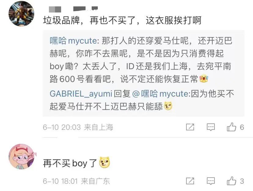 还有网友在 BOY LONDON官方微博置顶内容下进行评论,“下头“、“再也不买了”等。