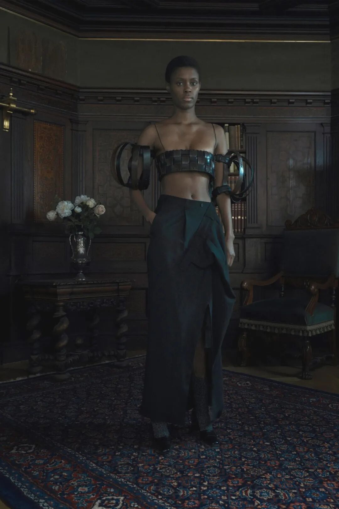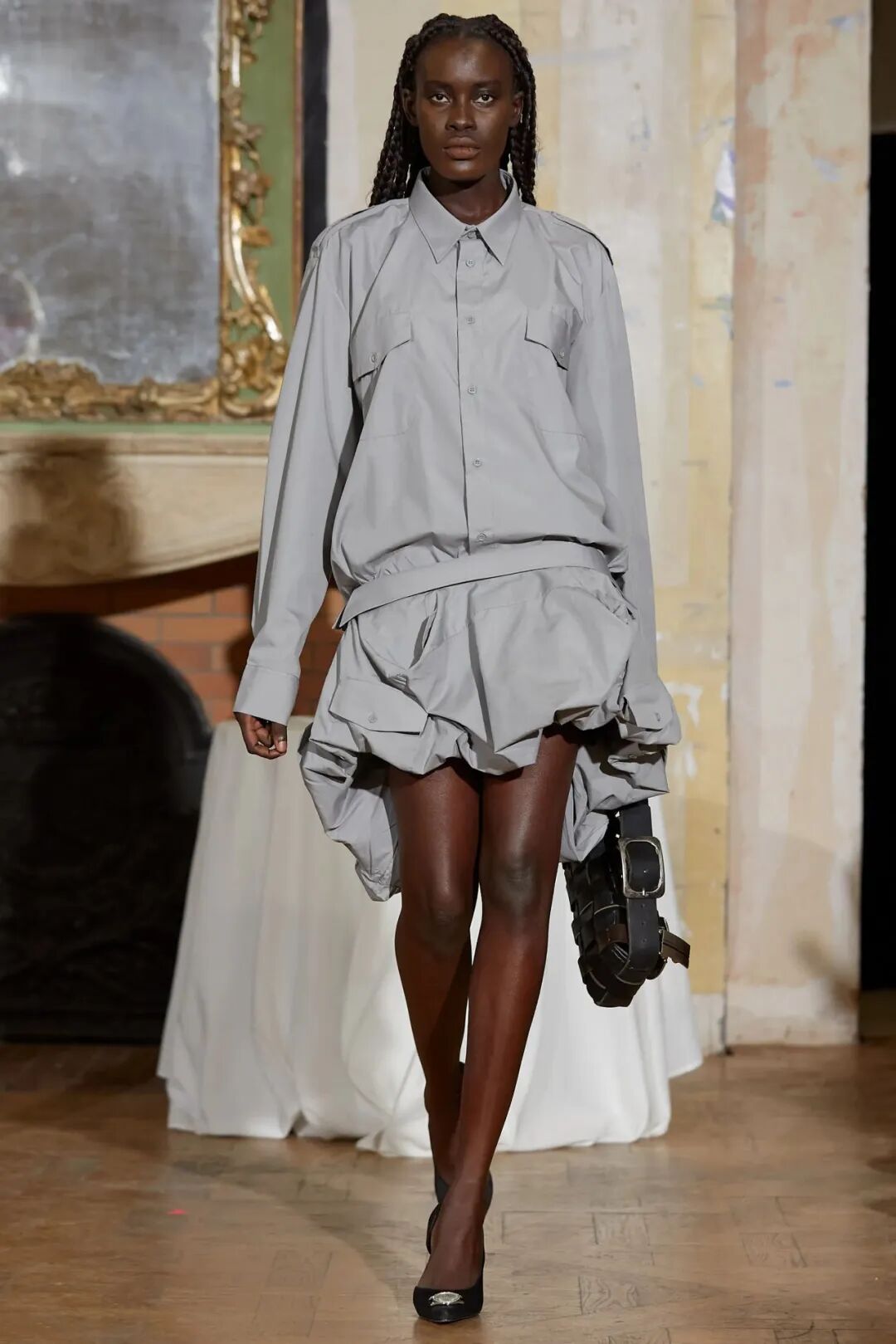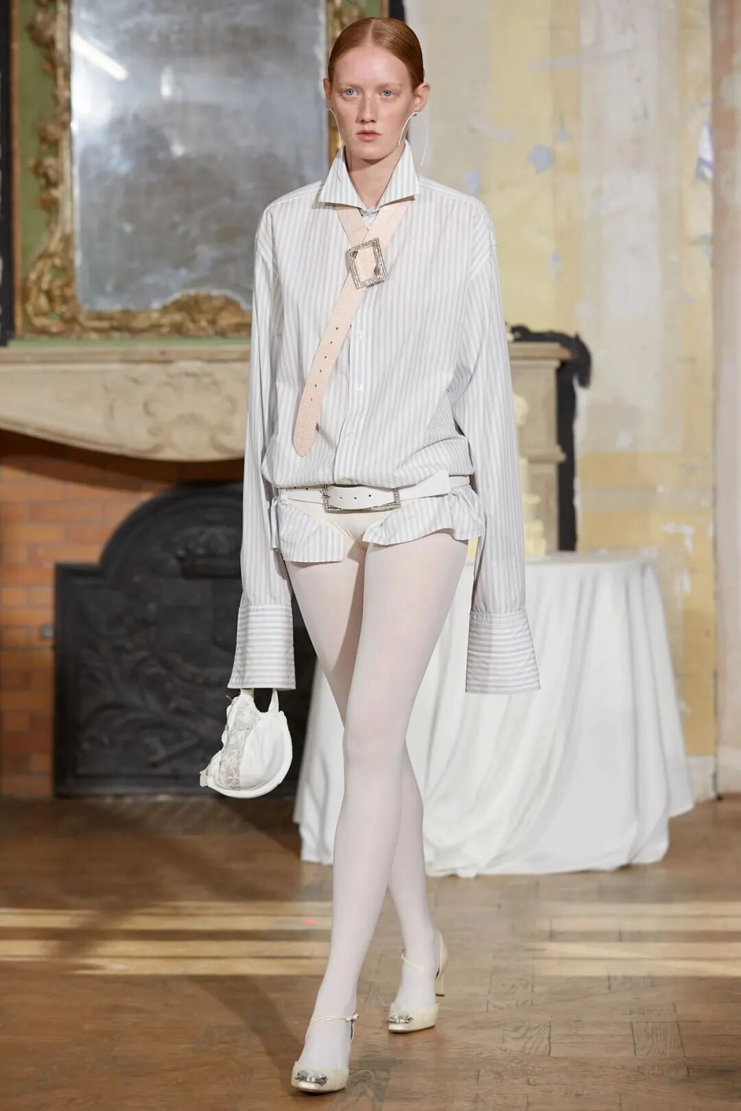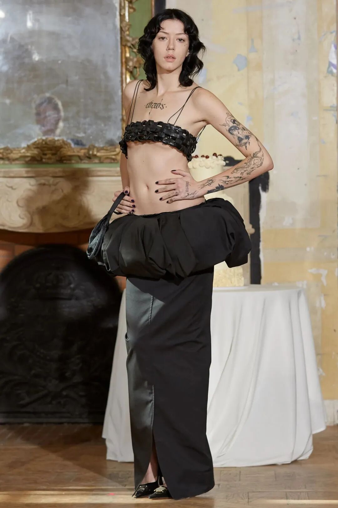 模特们把金属内衣当作耳环来佩戴。Ellen Hodakova Larsson太擅长把实用主义的工作服转化为浪漫的东西。灰色的瑞典军装衬衫被做成了迷你裙,而一件高贵的露肩长袍是由Elis提供的医院服装制成的,Elis是一家工业服装生产商,也是本次秀的赞助商。