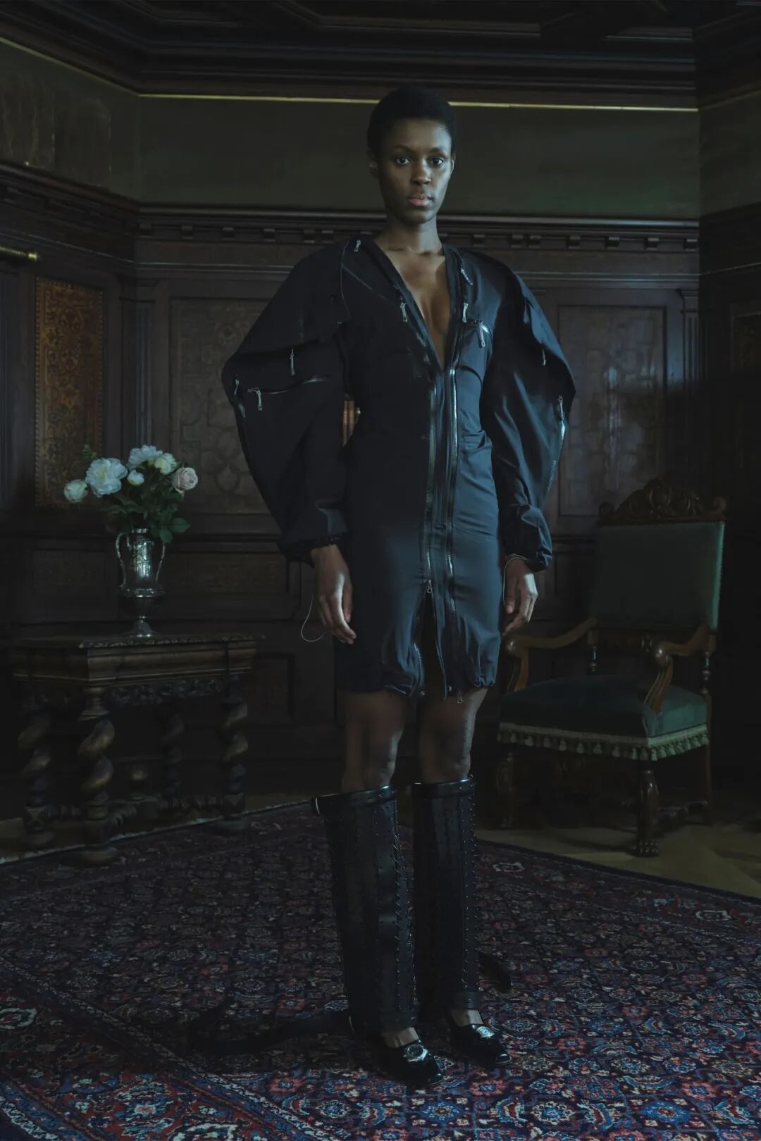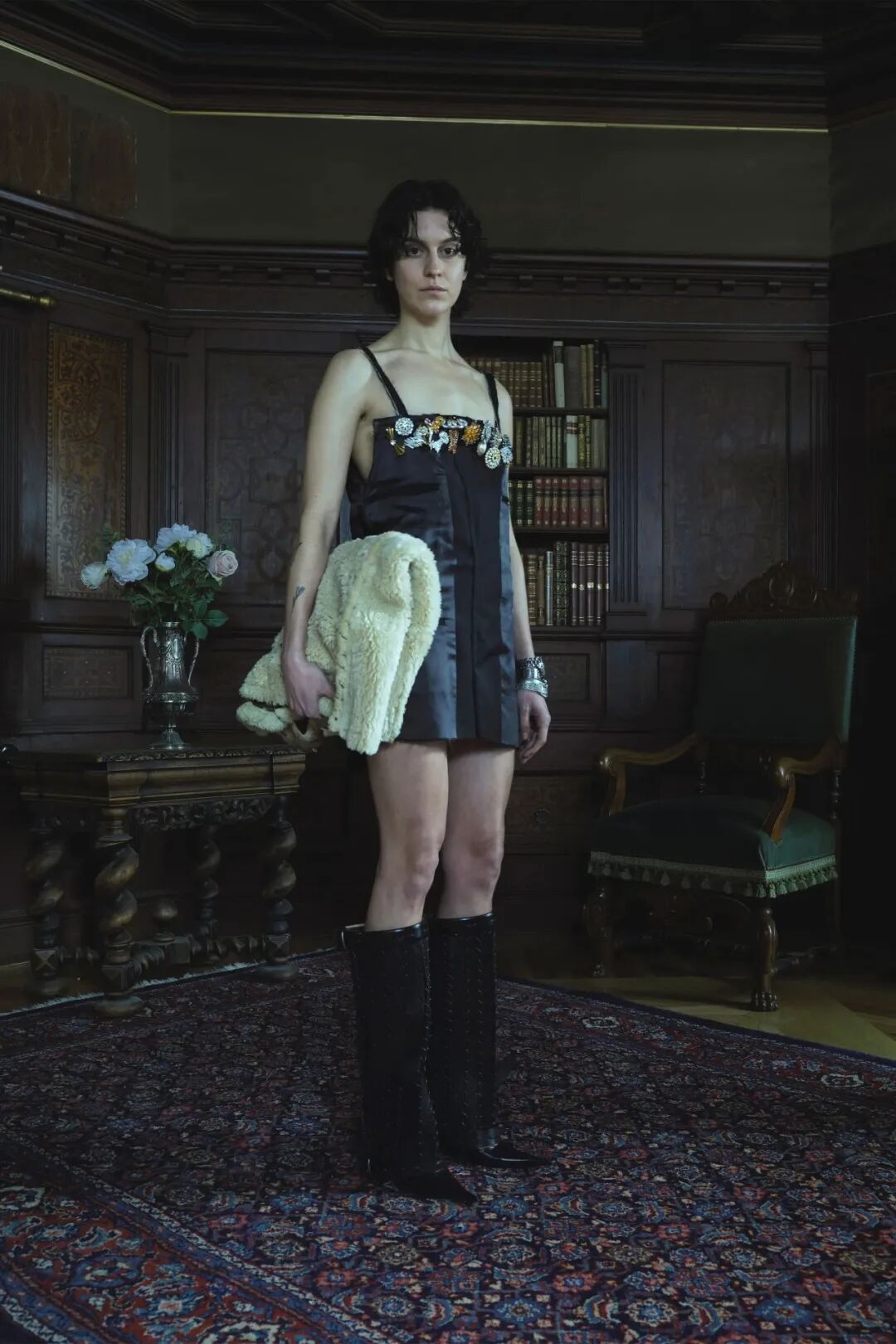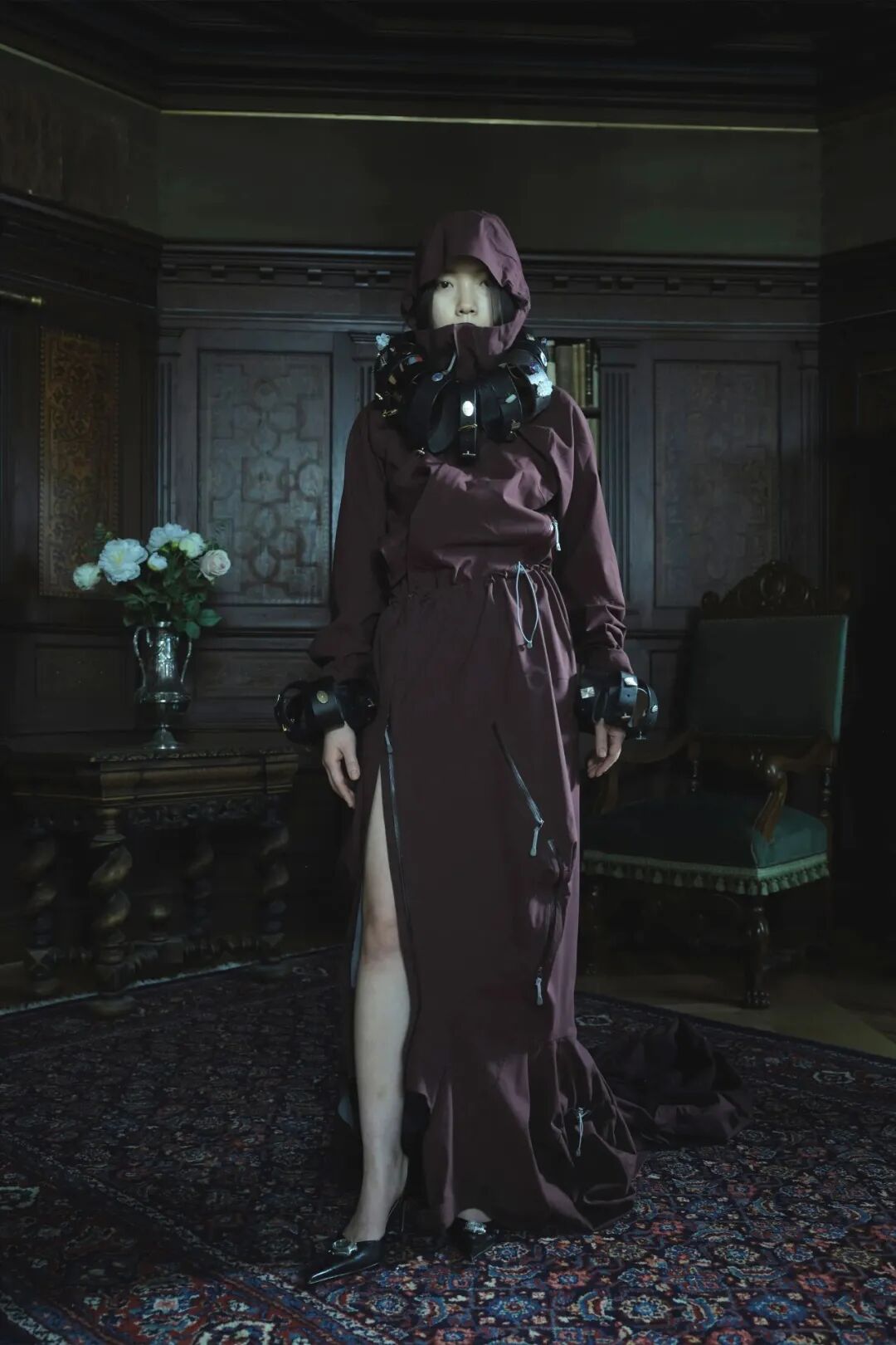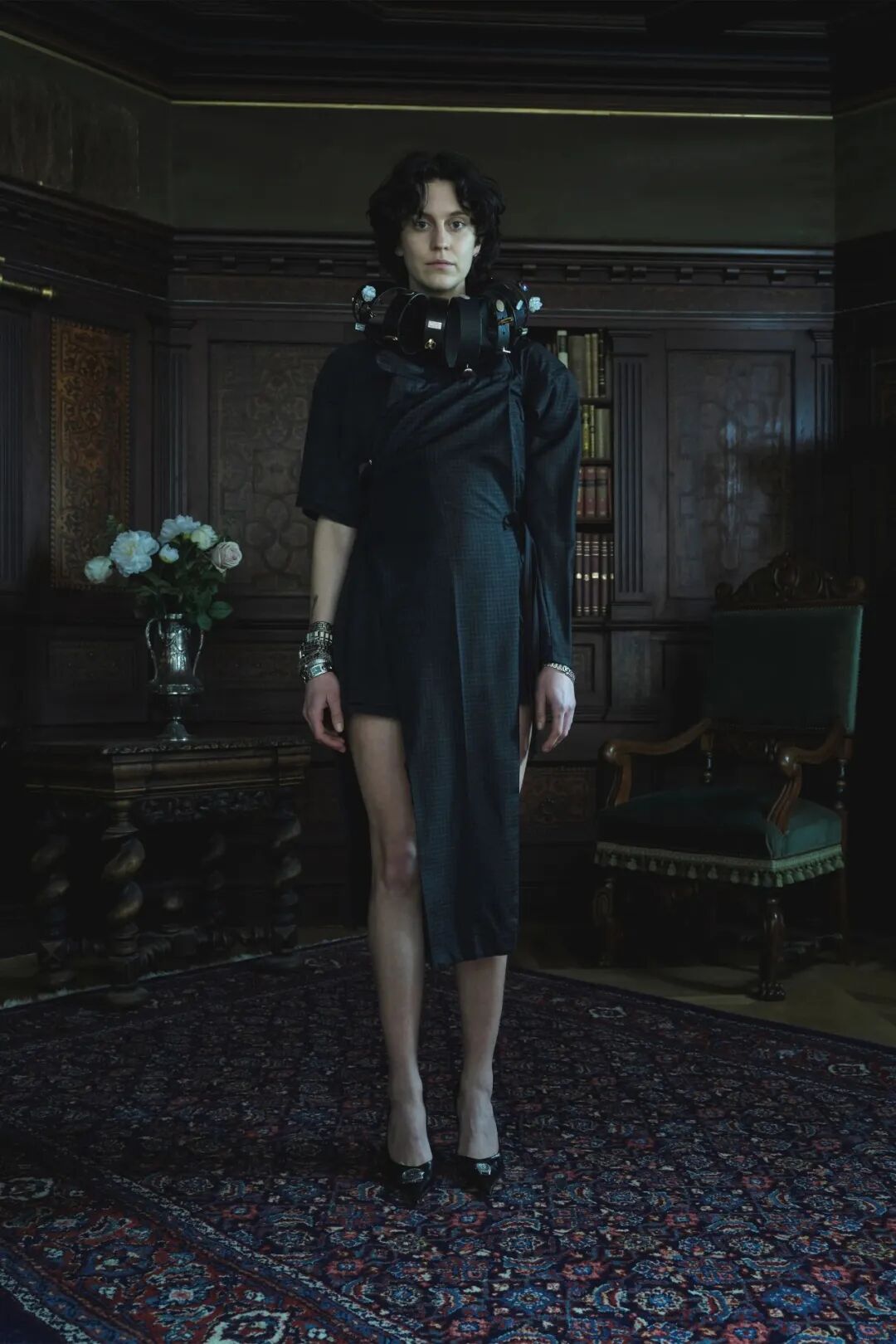模特们把金属内衣当作耳环来佩戴。Ellen Hodakova Larsson太擅长把实用主义的工作服转化为浪漫的东西。灰色的瑞典军装衬衫被做成了迷你裙,而一件高贵的露肩长袍是由Elis提供的医院服装制成的,Elis是一家工业服装生产商,也是本次秀的赞助商。