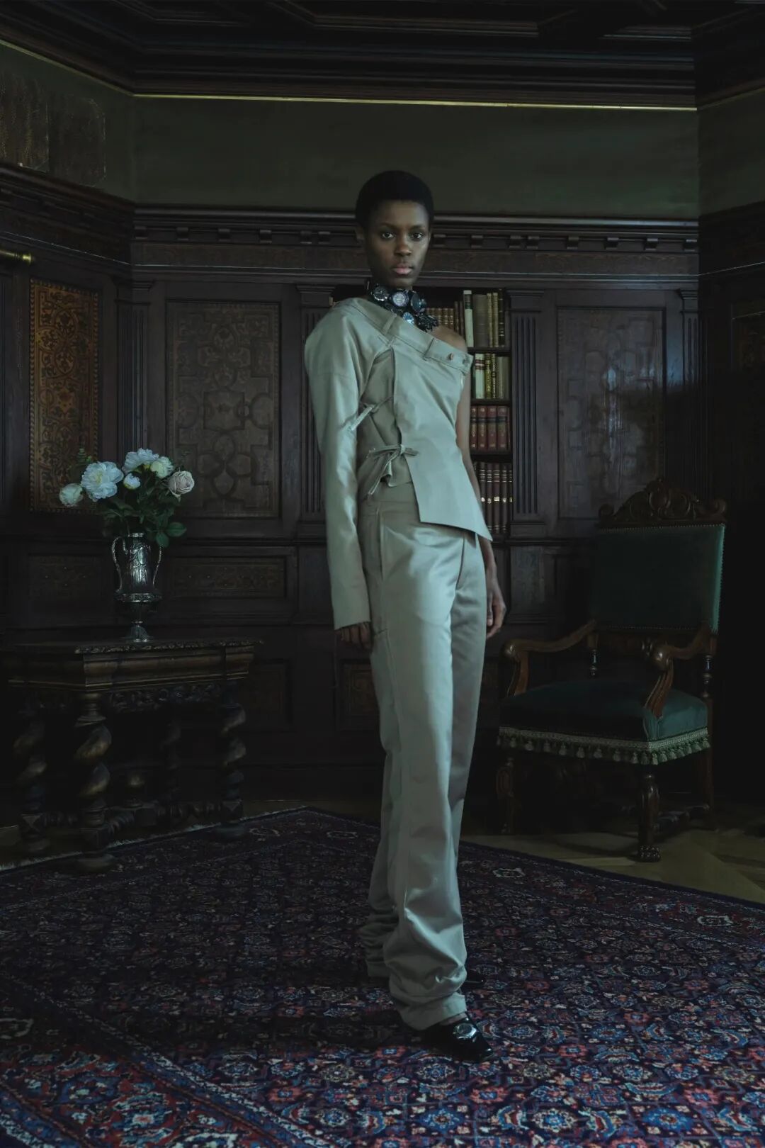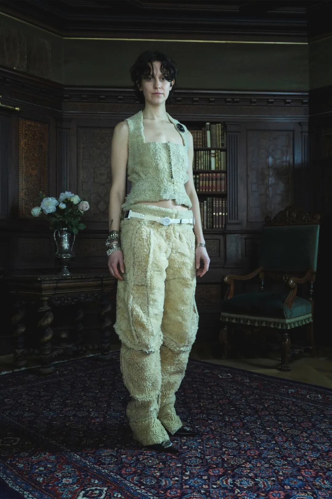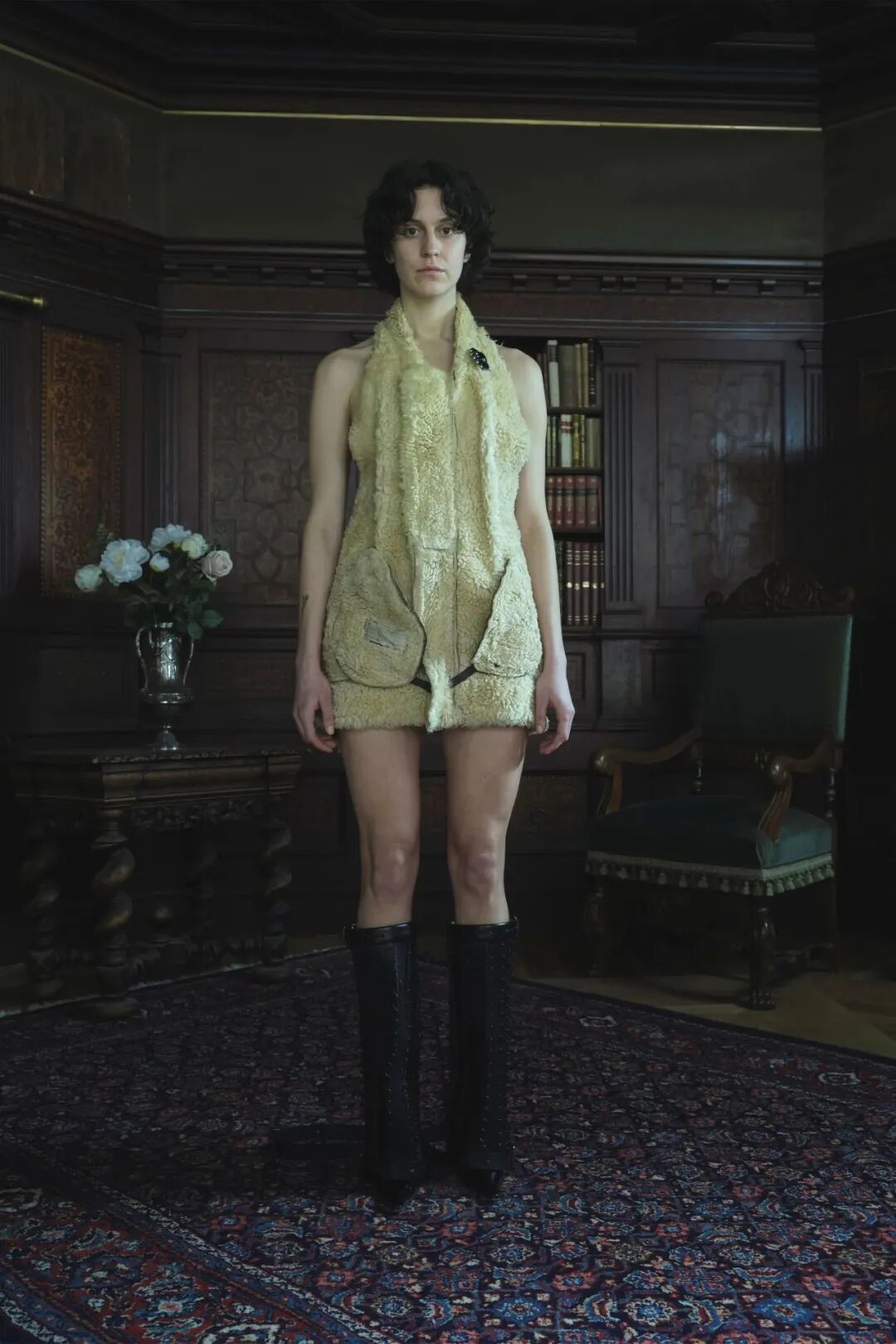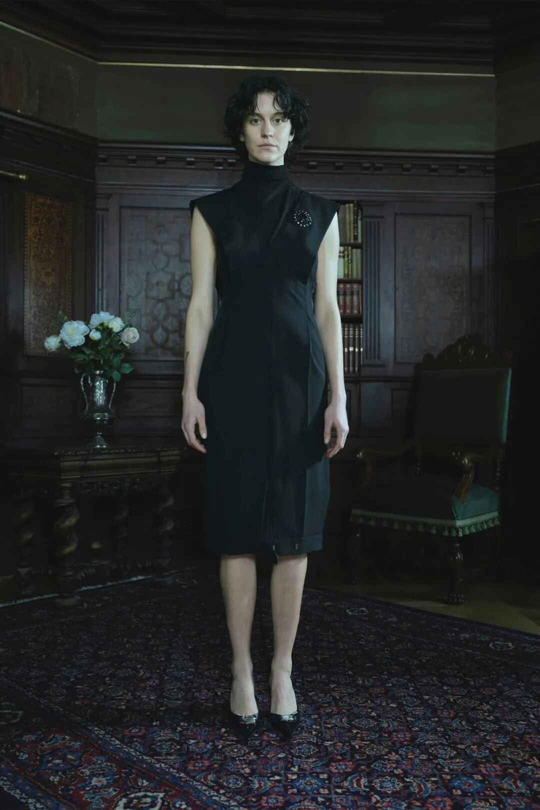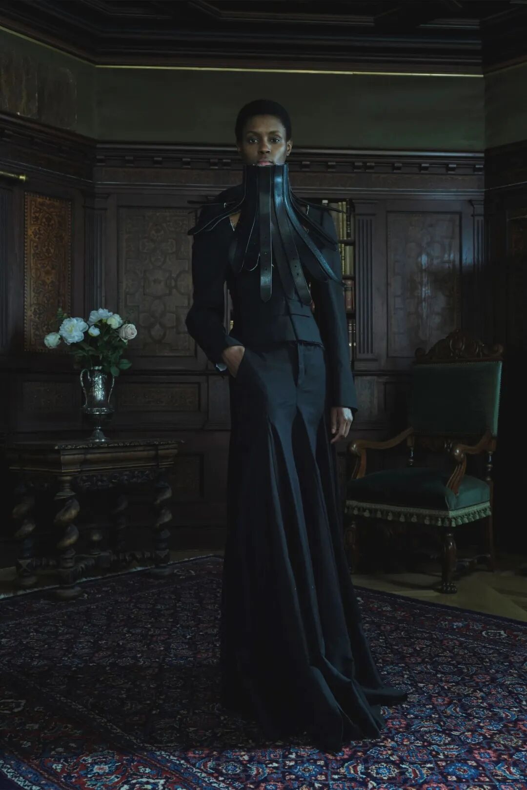 模特们把金属内衣当作耳环来佩戴。Ellen Hodakova Larsson太擅长把实用主义的工作服转化为浪漫的东西。灰色的瑞典军装衬衫被做成了迷你裙,而一件高贵的露肩长袍是由Elis提供的医院服装制成的,Elis是一家工业服装生产商,也是本次秀的赞助商。