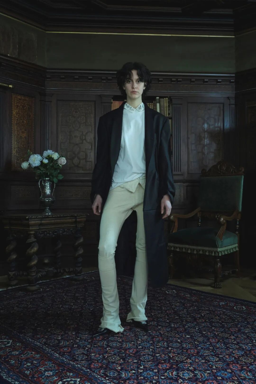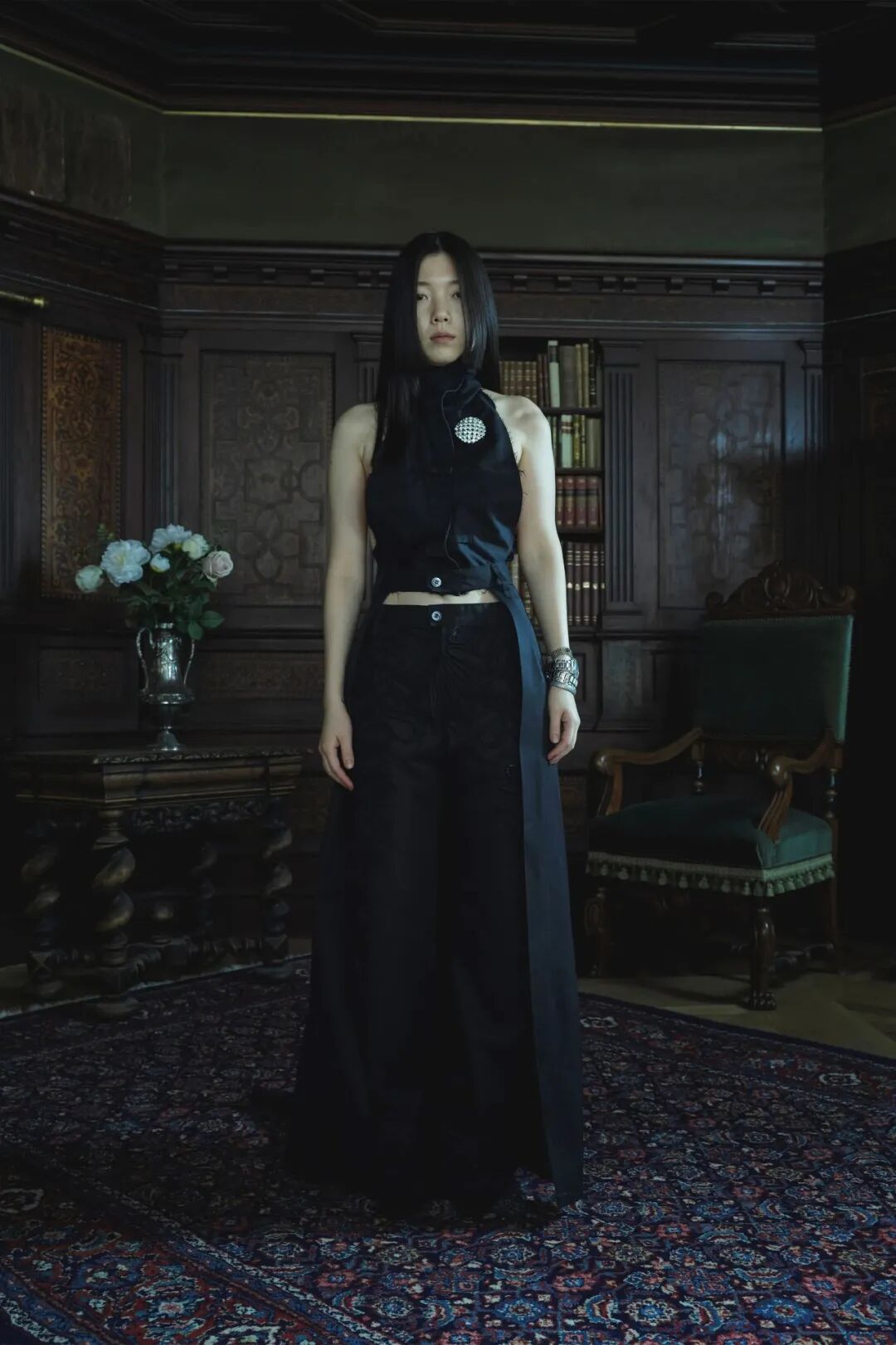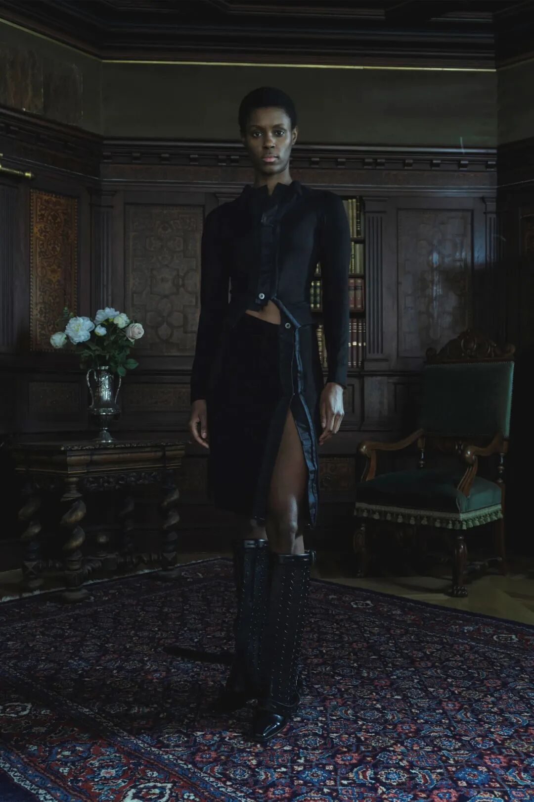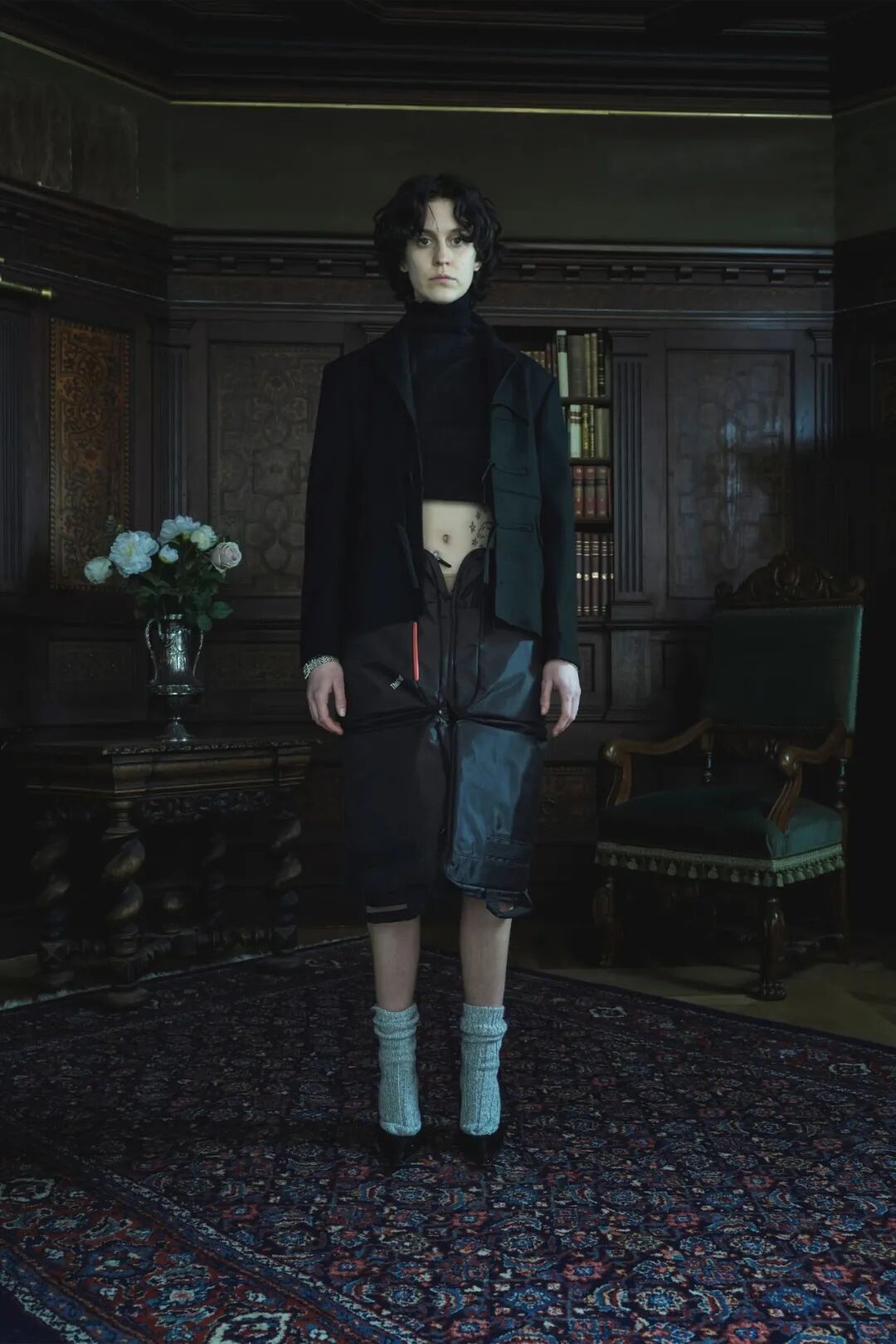模特们把金属内衣当作耳环来佩戴。Ellen Hodakova Larsson太擅长把实用主义的工作服转化为浪漫的东西。灰色的瑞典军装衬衫被做成了迷你裙,而一件高贵的露肩长袍是由Elis提供的医院服装制成的,Elis是一家工业服装生产商,也是本次秀的赞助商。