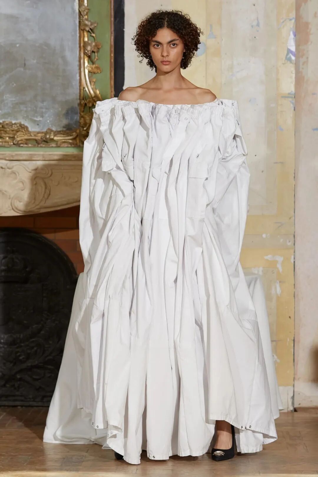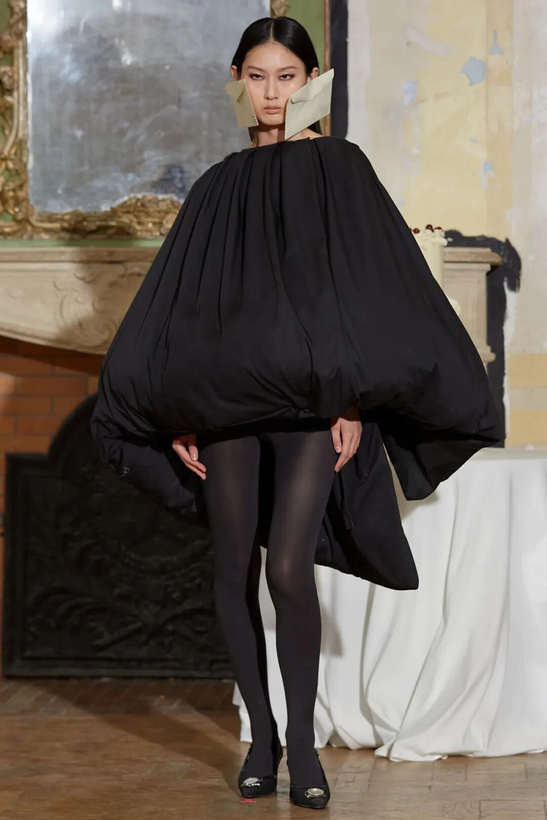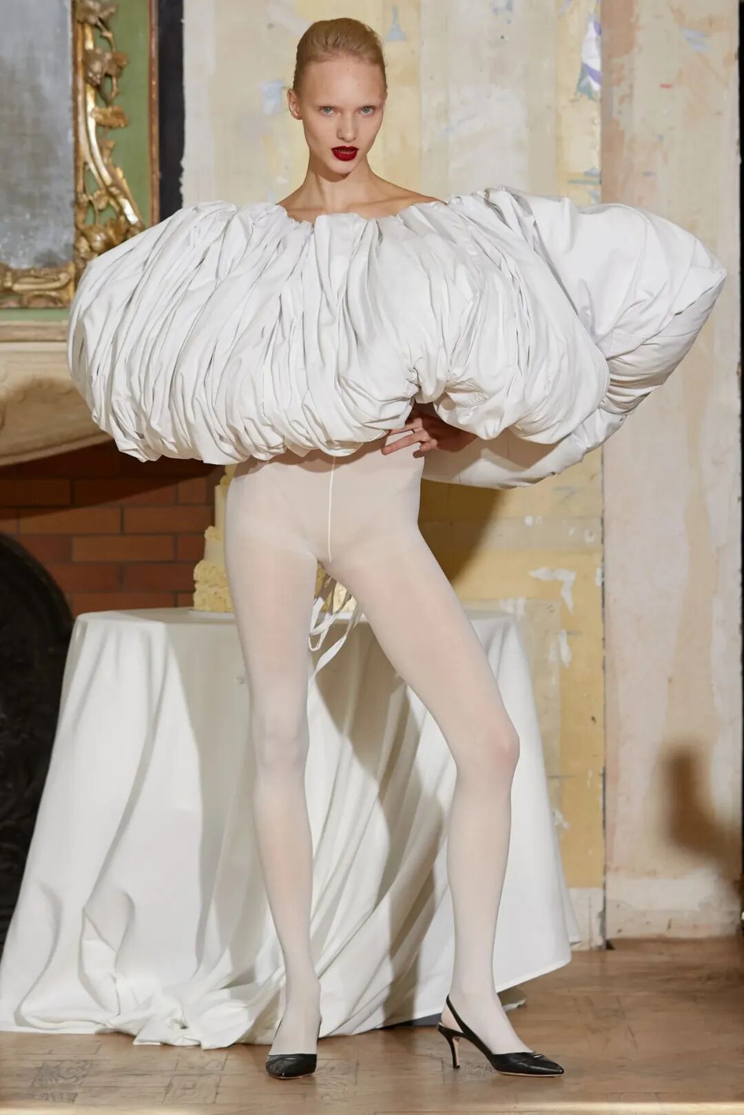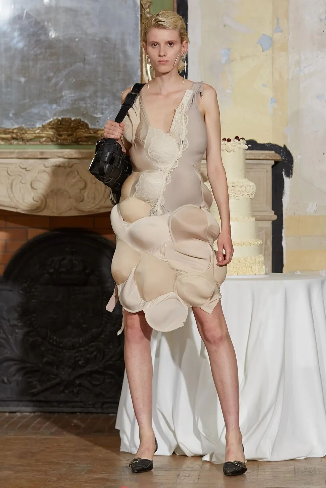 本季不断涌现的气泡形状,有的像一个填充的甜甜圈,灵感来自于17世纪的填充内衣。设计师扩大了由侧面翻转的腰带制成的连衣裙的镂空网眼,而一个pannier连衣裙——本季最出人意料的设计——在短裤上开了侧缝。