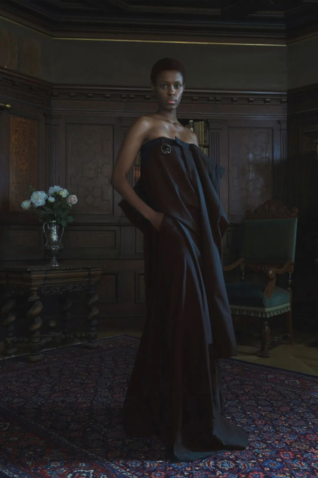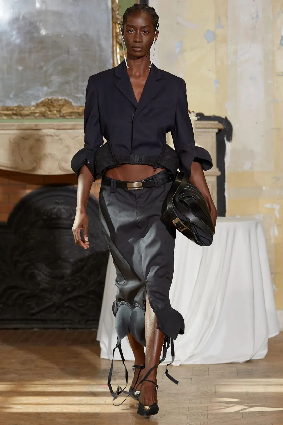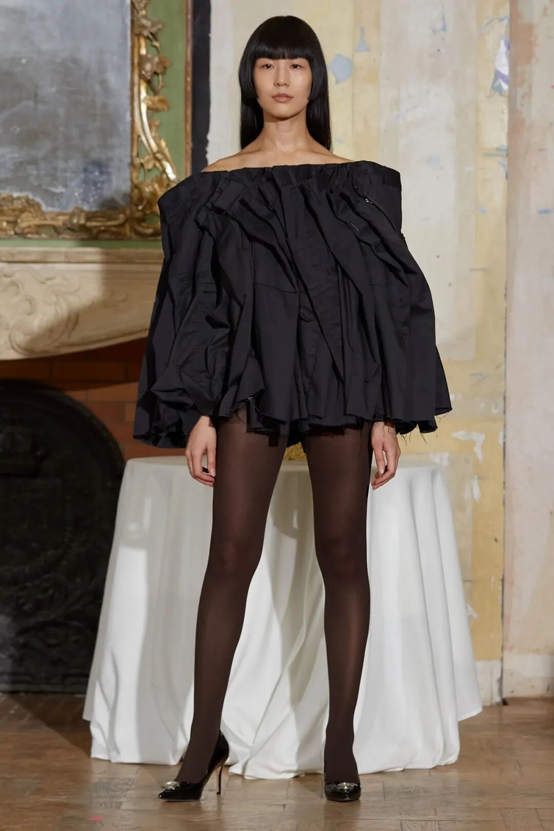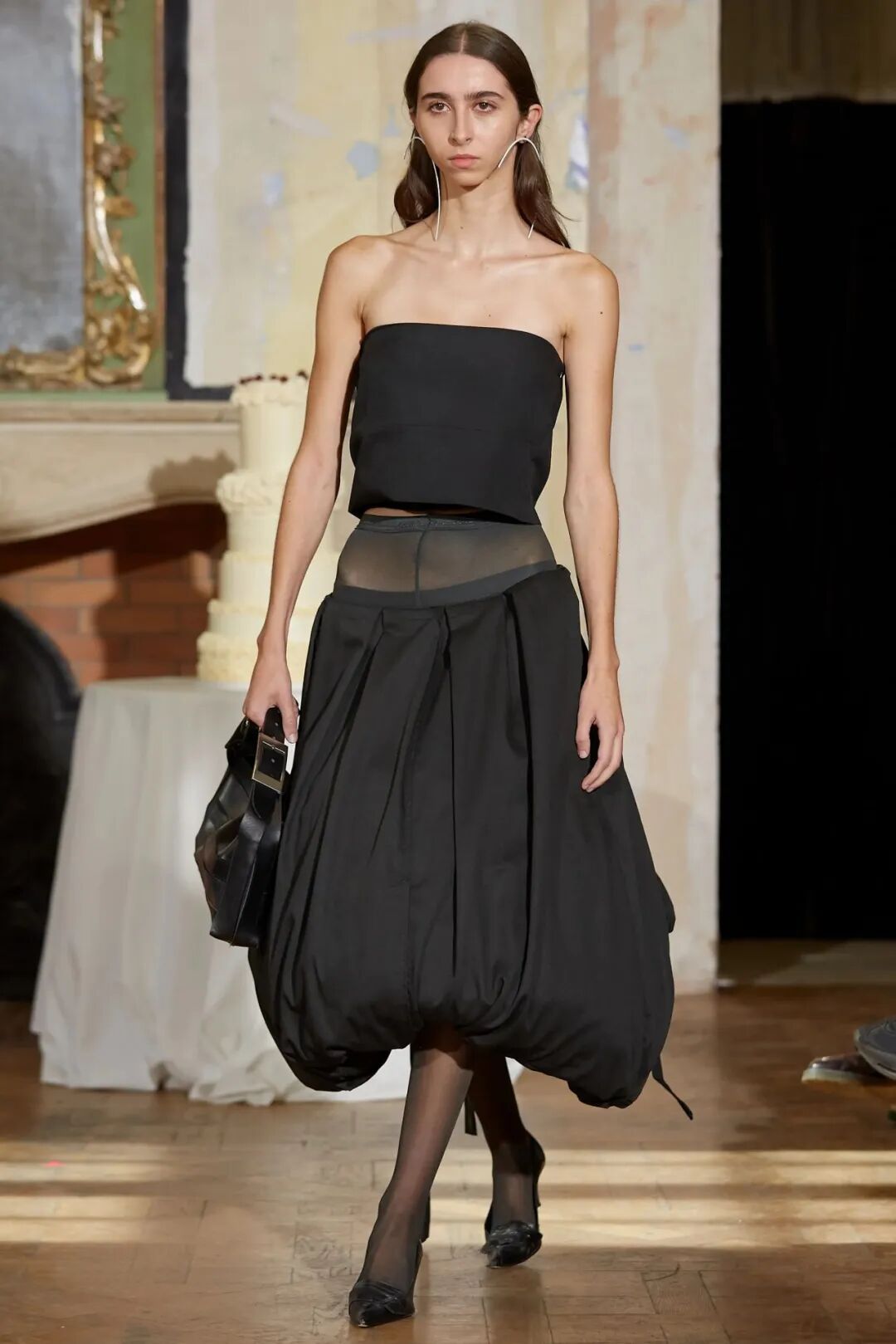 本季不断涌现的气泡形状,有的像一个填充的甜甜圈,灵感来自于17世纪的填充内衣。设计师扩大了由侧面翻转的腰带制成的连衣裙的镂空网眼,而一个pannier连衣裙——本季最出人意料的设计——在短裤上开了侧缝。
