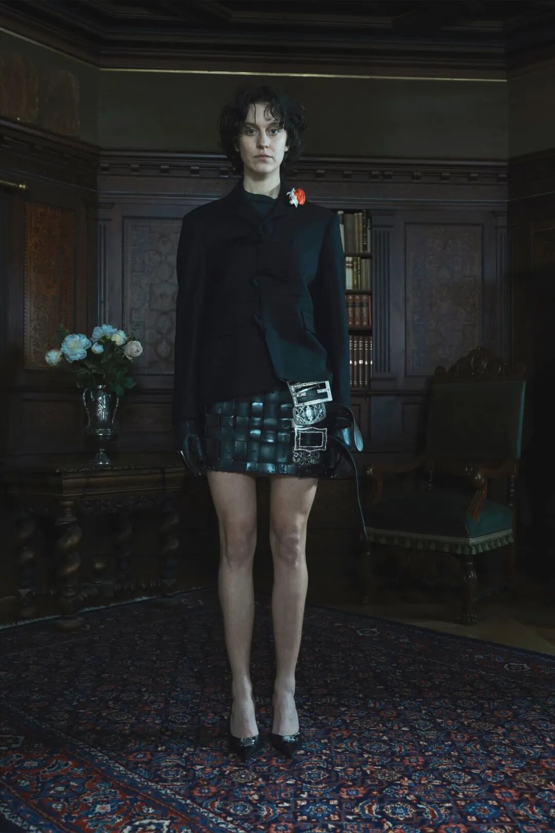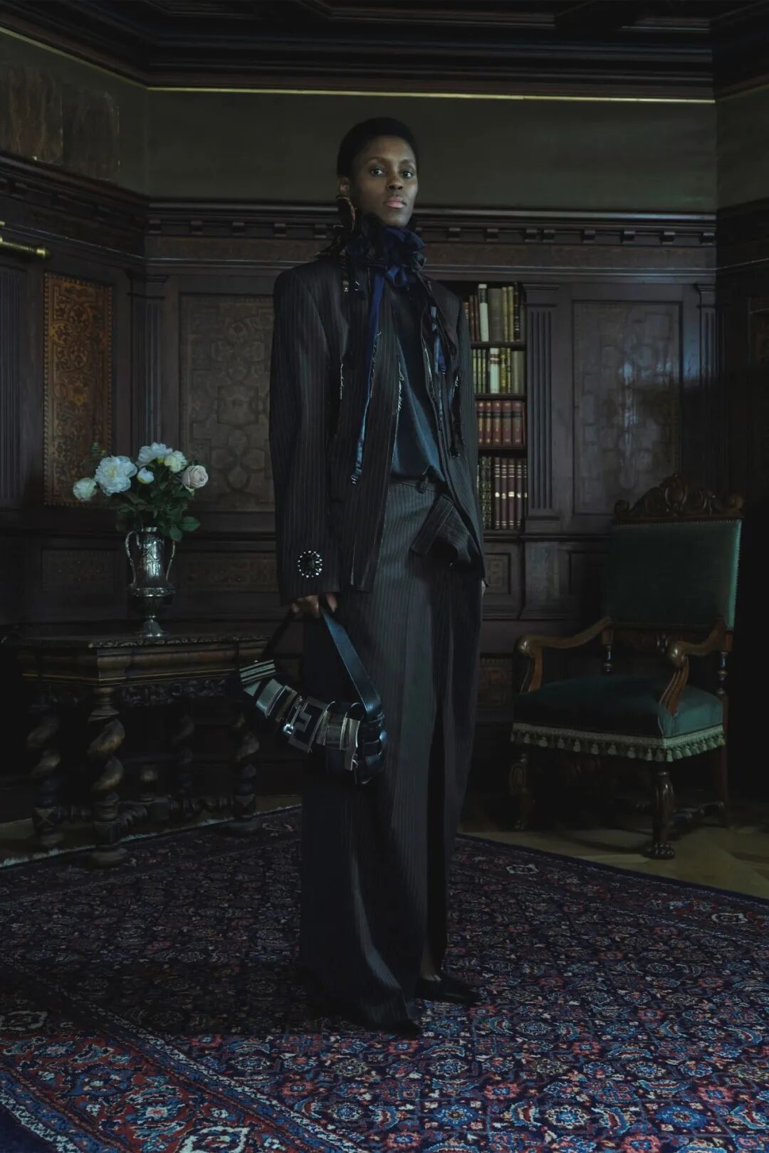 重新加工和打蜡的细条纹裙装又让服装具有了某些坚固的精神气。