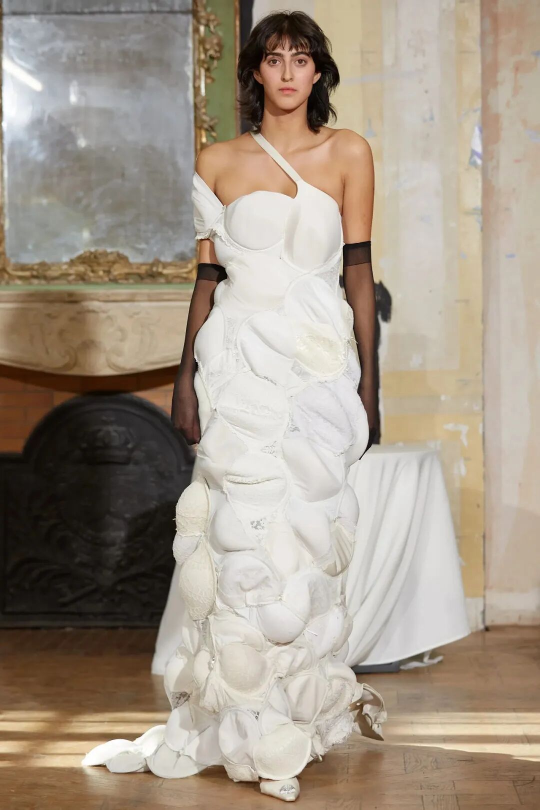 另一件丰满而有质感的白色连衣裙是由拉尔森工作室的废旧布料组成的纺织品制成的。