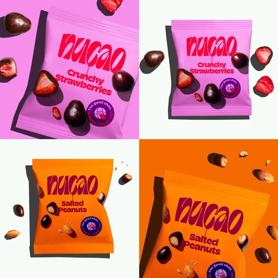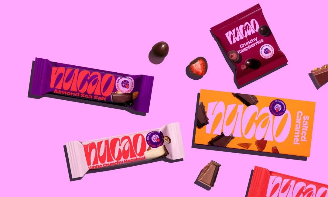Nucao成立于2016年,是一个由公平贸易可可制成的有机和素食巧克力产品的品牌。新的包装几乎不可能错过,它有明亮而大胆的颜色搭配,超大的标志,以及在字体、标志和彩色背景之上的产品剪影样本的良好互动。有时,舌头-行星的标签感觉有点大,开始需要更多的关注,我对标志的“c”滴入产品味道的情况提出质疑,但是,除此之外,这是一个伟大而简单的系统,可以适应产品的各种尺寸而不失去任何影响。