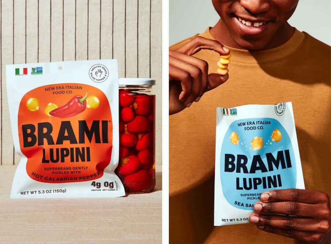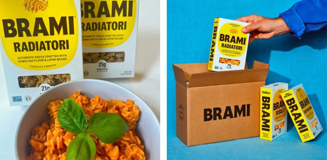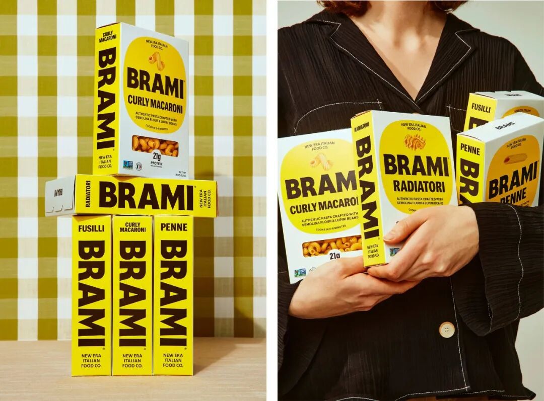 Brami于2016年推出,是一个以古老的意大利羽扇豆为燃料的植物性产品品牌。意大利面的包装非常好,纯黄色、棕色和白色的调色板看起来非常好,而且那个大的、大胆的、全黄色的书脊对于意大利面的包装来说似乎很新颖,通常在书脊上有一些冗长的介绍或食谱或其他一些文字和细节。这就像一个书脊,看起来很棒。