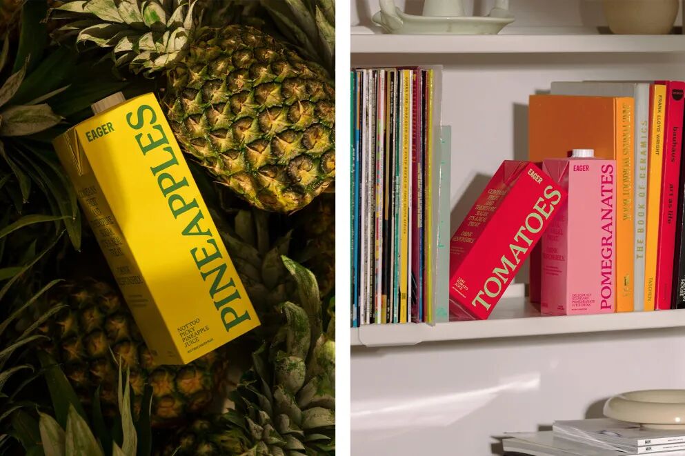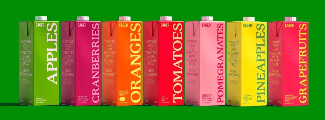 Eager成立于2007年,是一个在英国上市的果汁系列。旧的包装有点聪明,通过改变字母的比例并在上面添加合适的叶子或茎,设法将“e”变成不同的水果。它们色彩鲜艳、大胆、充满活力,但如前所述,它看起来更像是你在小学食堂找到的产品,而不是在酒吧后面。新的包装采用了一种极简主义的方法,通过在纸盒正面尽可能大的侧向运行,使里面的水果成为英雄,标志在完全消失之前尽可能的小。