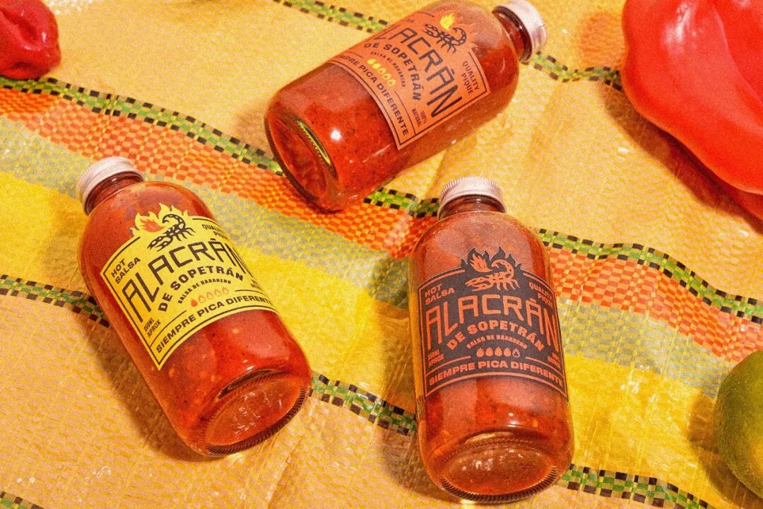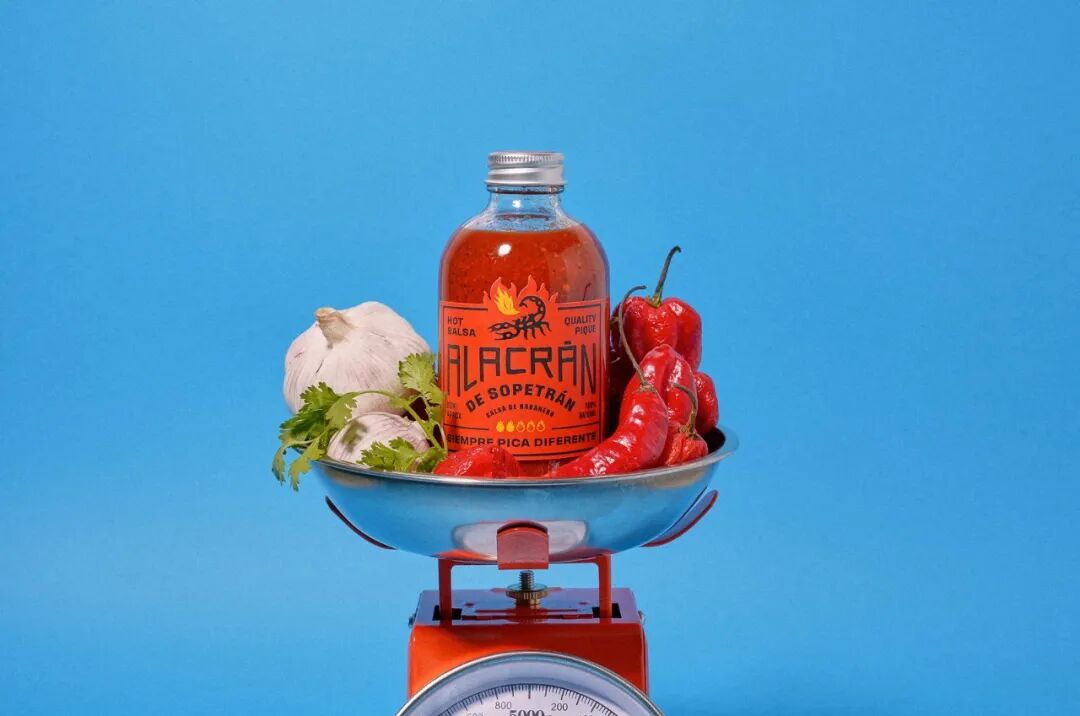 Alacrán de Sopetrán成立于2021年,是哥伦比亚的一个小品牌的辣酱。包装的标签三种热量变化使用相同的三种颜色进行了很好的区分,黄色是最不辣的,红色是辣的。在标签的底部是该品牌的标语。外包装也很好,在一个看起来简单而简陋的纸板箱中,由于采用了定制的字体,看起来每一个都是手工绘制的。