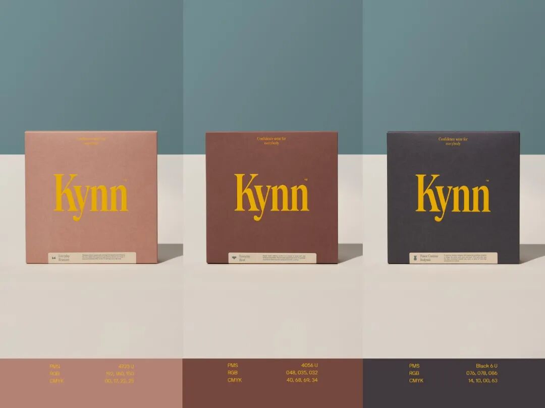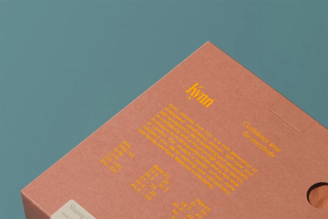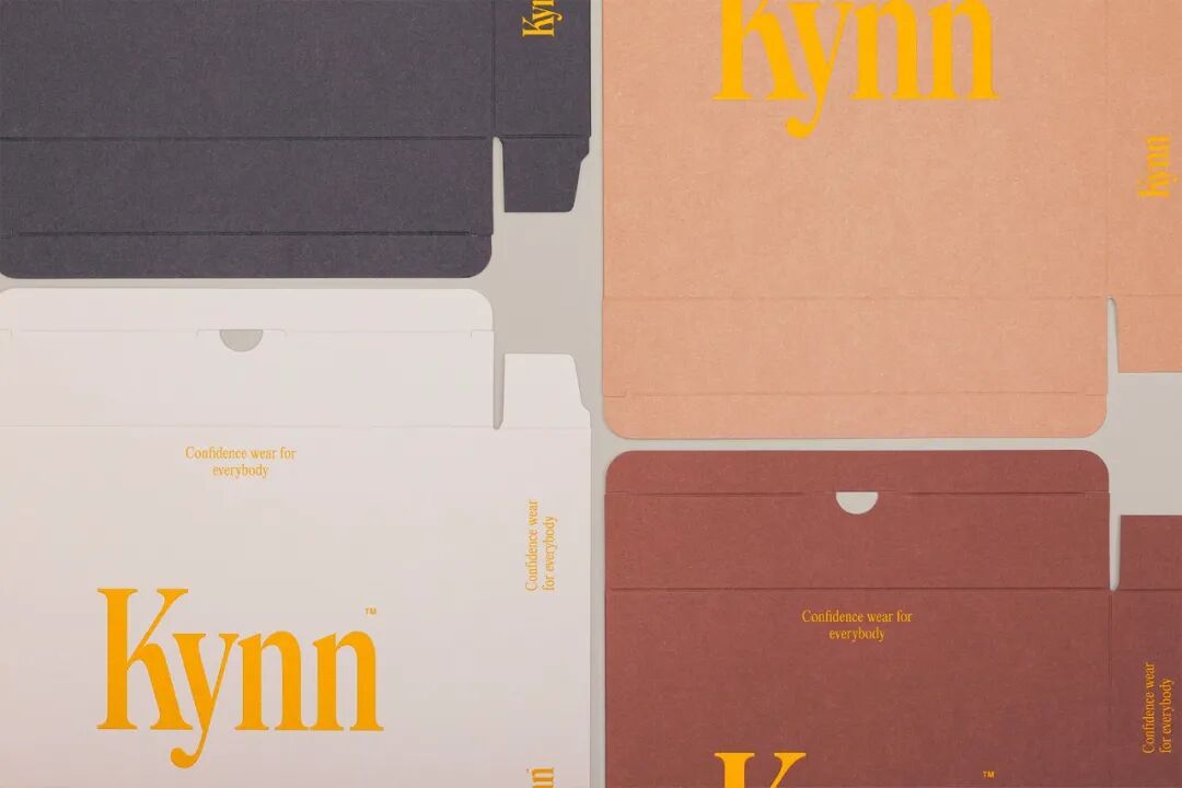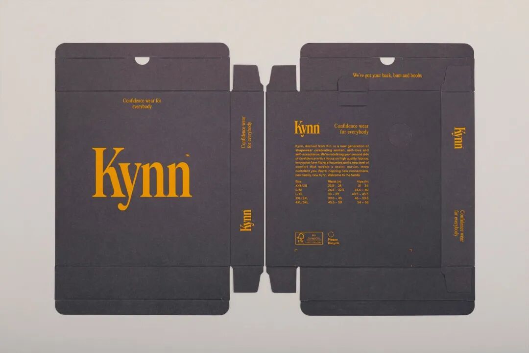 Kynn成立于2022年,是一个位于新西兰的新的塑身衣和内衣品牌。包装将设计保持在最低限度,标志在盒子的前面和中间使用,始终是相同的黄色,因为盒子的颜色根据不同的肤色而变化,在达到浅色调时,即使是最低的对比也能保持可读性。所有产品都使用一个单一尺寸的盒子和格式,然后通过底部的标签来识别胸罩、内裤或连体裤,这种方法很聪明,可以降低生产成本。
