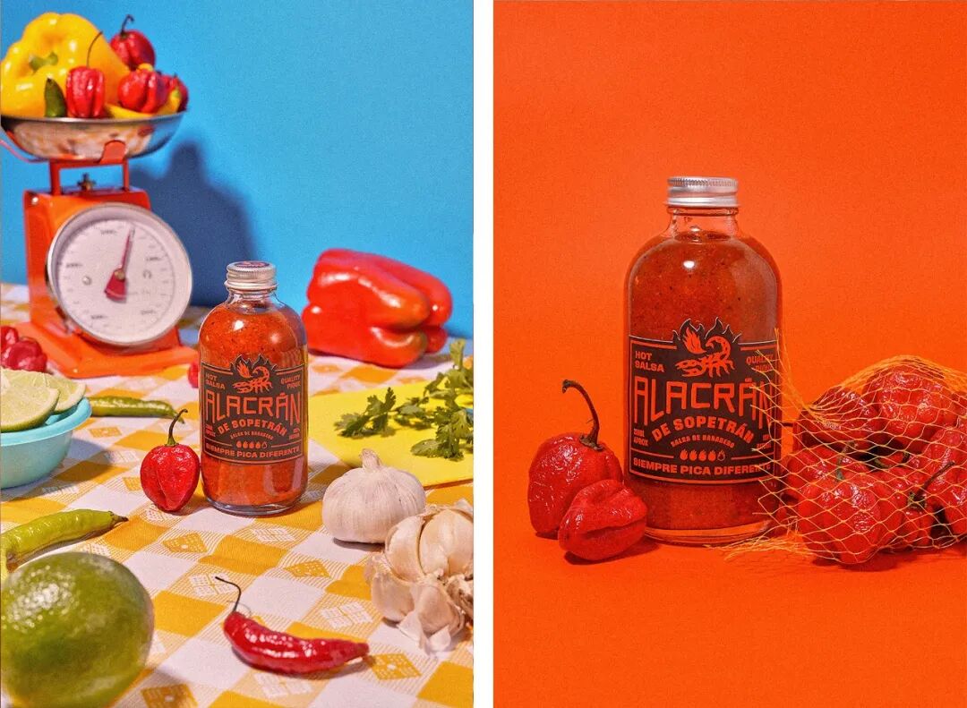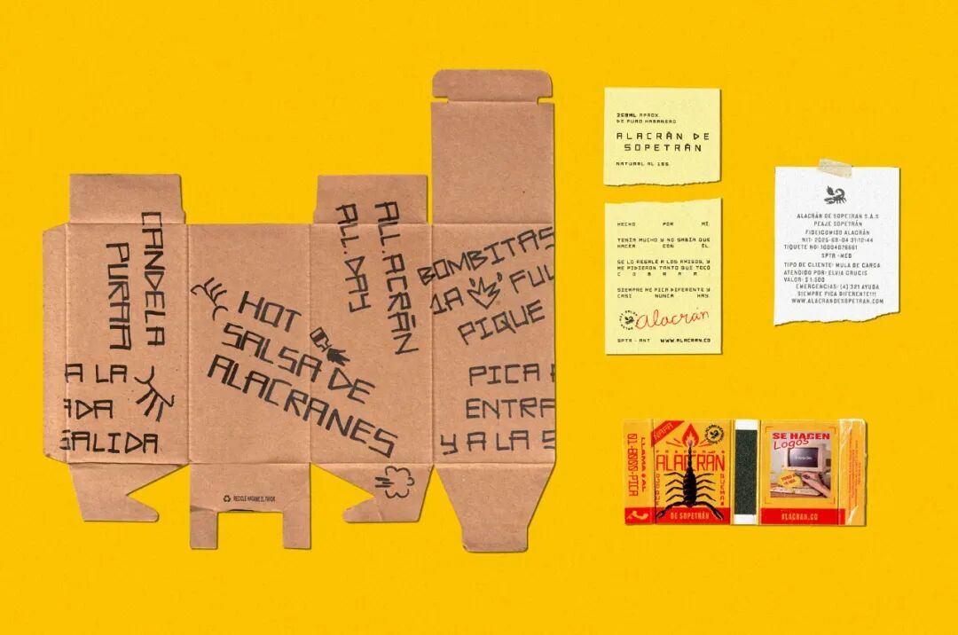Alacrán de Sopetrán成立于2021年,是哥伦比亚的一个小品牌的辣酱。如今有了一个身份更加巩固的品牌,包括Sopetrán Sans字体,灵感来自哥伦比亚小城镇的广告,在Bastarda Type的帮助下创建设计了标签和包装;商品项目;基于口语的休闲语气;照片、插图和社交媒体帖子,暗指我们日常生活中的流行表达和见解。