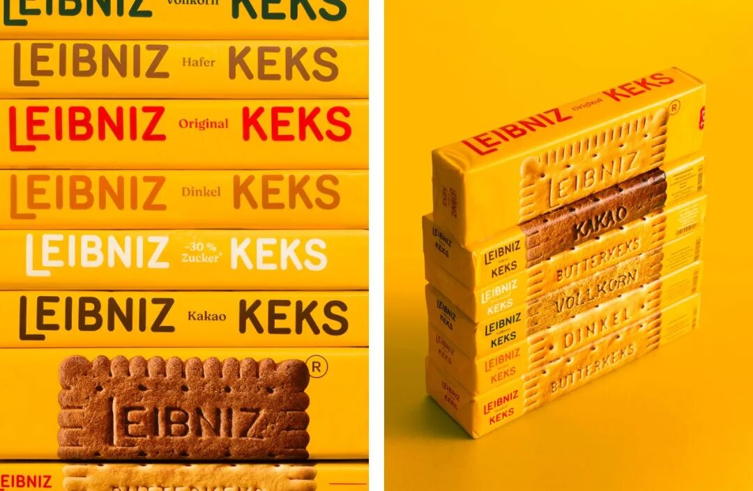 莱布尼兹于1891年推出,是全世界最知名的黄油饼干之一。新包装令人惊叹,饼干的微距摄影占据了盒子的整整两面,正如在关于字母图案的段落中提到的,饼干后面使用了一个大的注册标记。这里的设计方法也是Auge Design为Bahlsen设计的2021年包装系统的一个很好的延伸,它建立在它的基础上,而不仅仅是完全复制它,同时让Leibniz品牌闪闪发光。