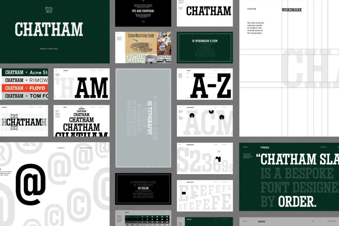 查塔姆是一个羊毛毯品牌,由亚历山大-查塔姆生产,他是亚历山大-查塔姆的曾孙,在1877年创立了查塔姆制造公司。设计团队Order确定了在整个查塔姆的历史时期所使用的各种板状字母。这种字体的最有力使用是在大约1940年代的原始“查塔姆毛毯”标签上。Order试图开发一个以字体为导向的标识,其基础的字体表达是毛纺公司历史上最常使用的板状字体。查塔姆毛毯的锁扣是专门用于毛毯产品的。它被精心绘制,包含在一个长方形的抱负形状中,最适合于标签刺绣。