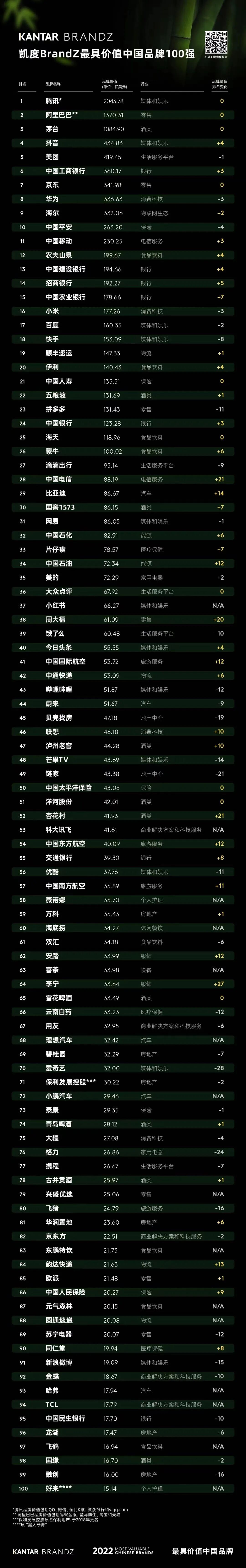 8月25日,2022年凯度BrandZ最具价值中国品牌100强排行榜(以下简称‘榜单’)发布。